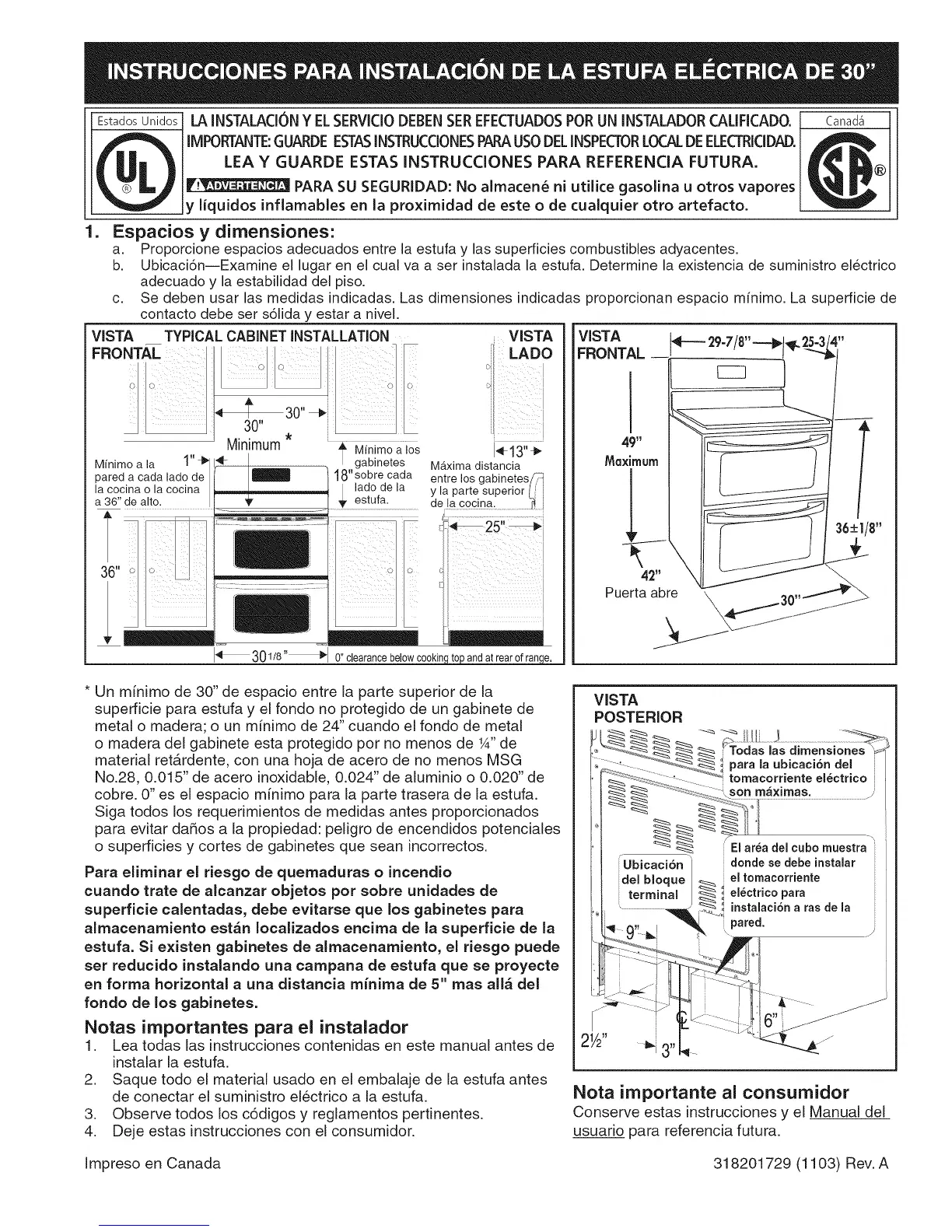 b. Ubicaci6n--Examine el lugar en el cual va a ser instalada la estufa. Determine la existencia de suministro electrico