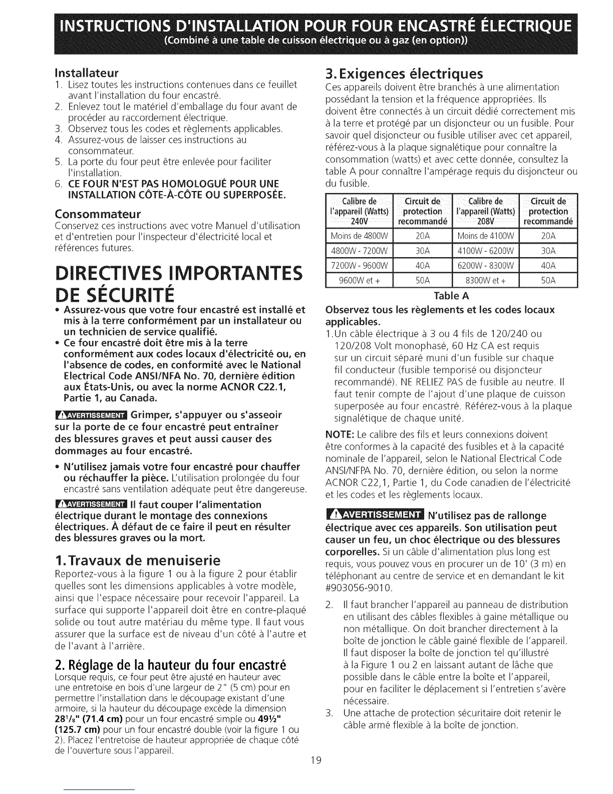 table A pour connattre I'amp_rage requis du disjoncteur ou