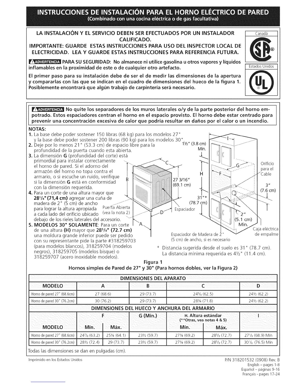 Hornos simples de Pared de 27 y 30 (Para hornos dobles, ver la Figura 2)