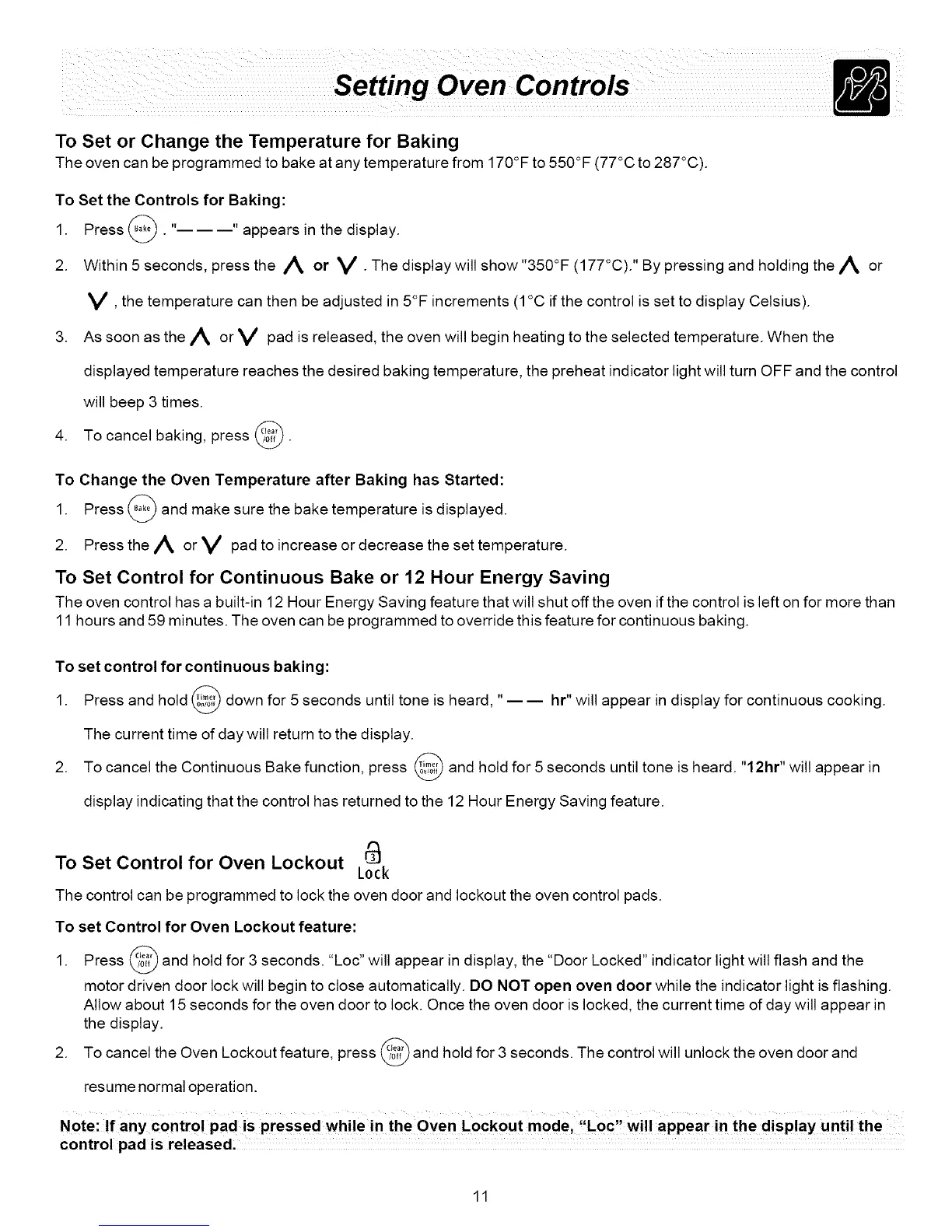 Note: If any control pad is pressed while in the Oven Lockout mode, LOC will appear in the display until the
