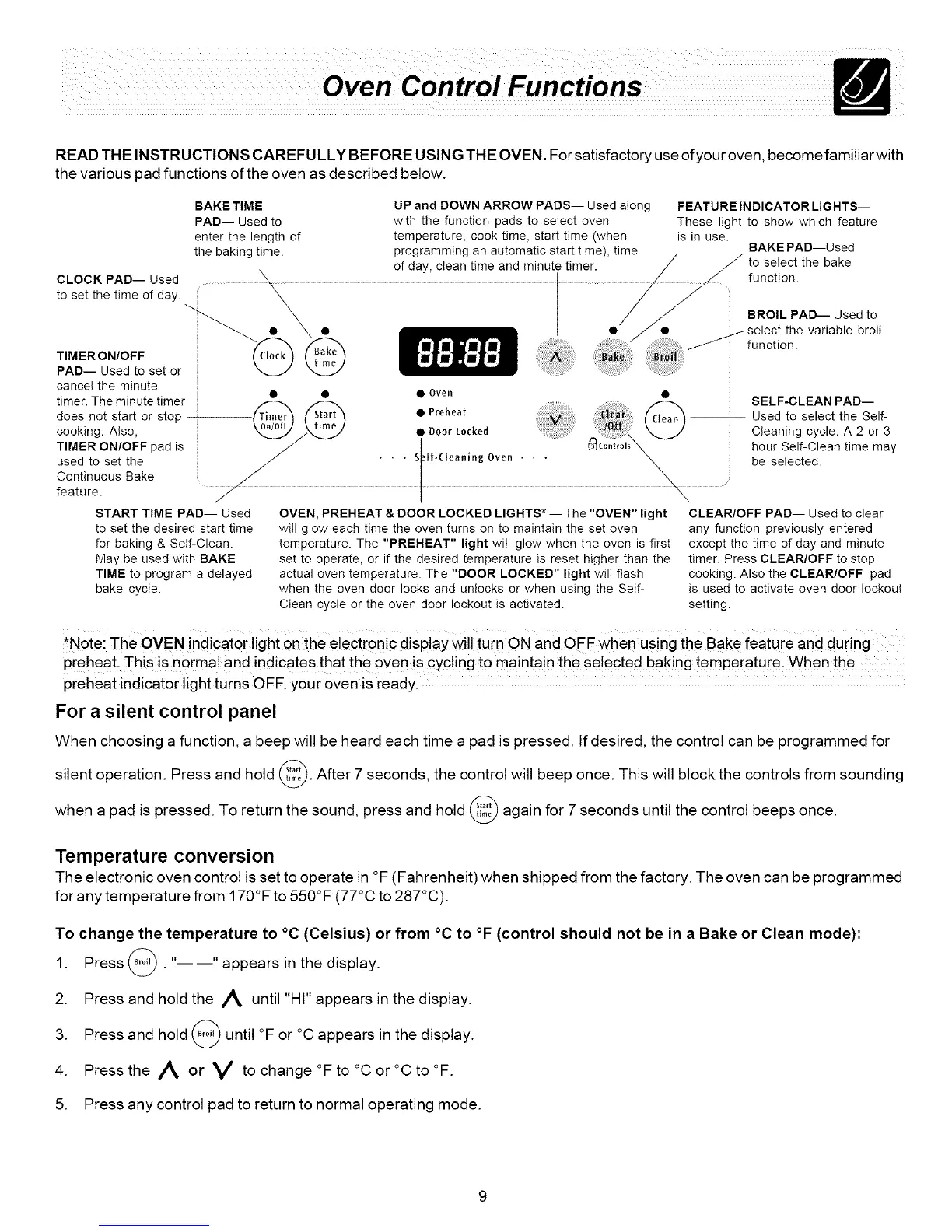 The electronic oven control is set to operate in °F (Fahrenheit) when shipped from the factory. The oven can be programmed