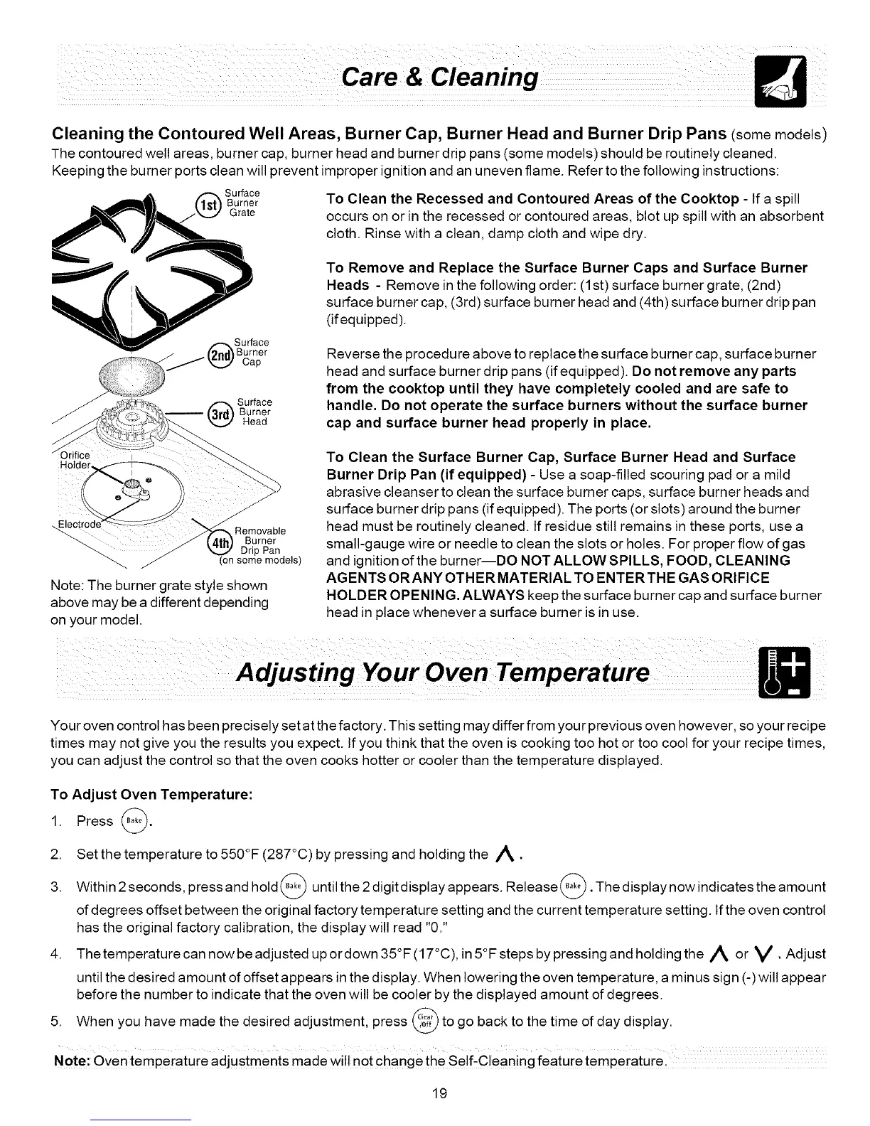 The contoured well areas, burner cap, burner head and burner drip pans (some models) should be routinely cleaned.