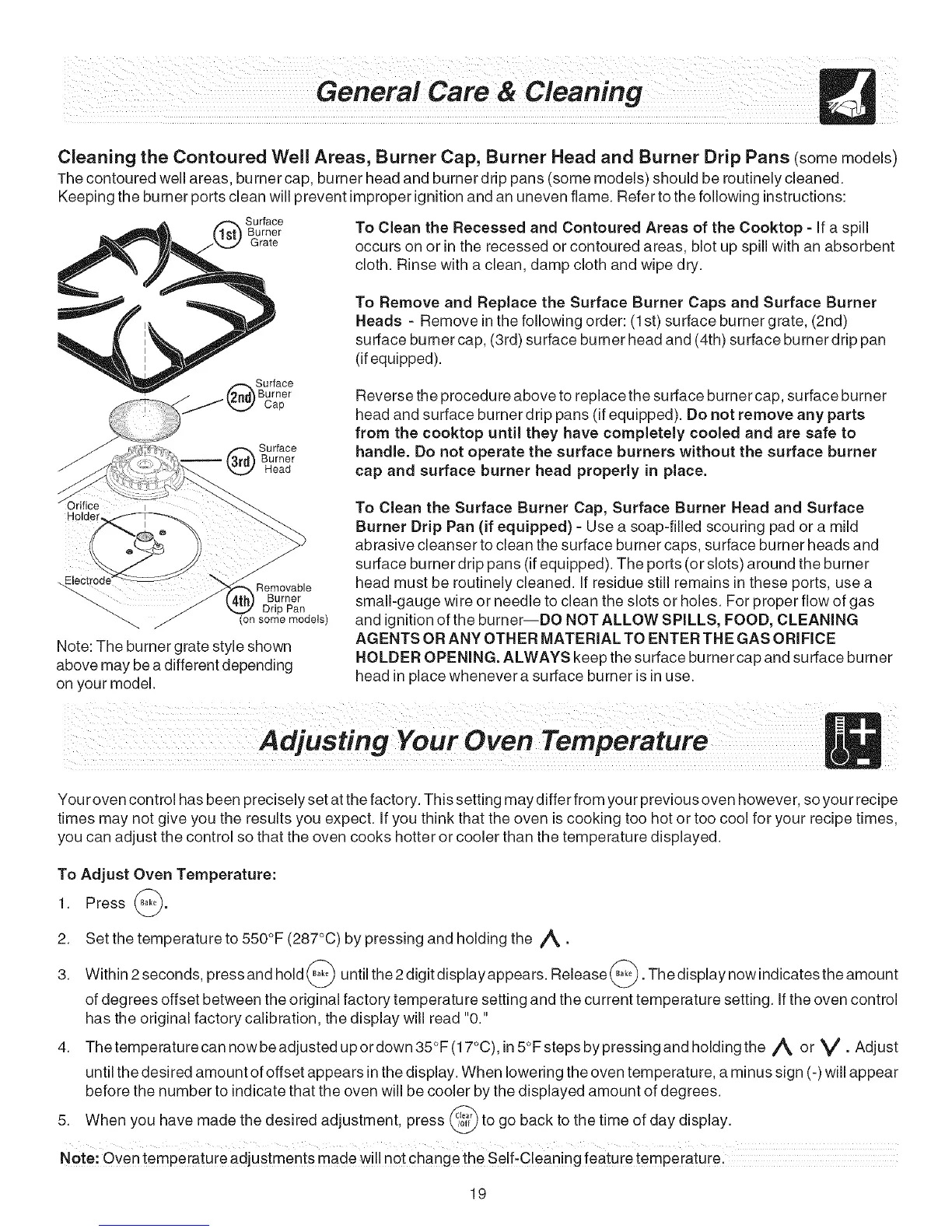 The contoured well areas, burner cap, burner head and burner drip pans (some models) should be routinely cleaned.