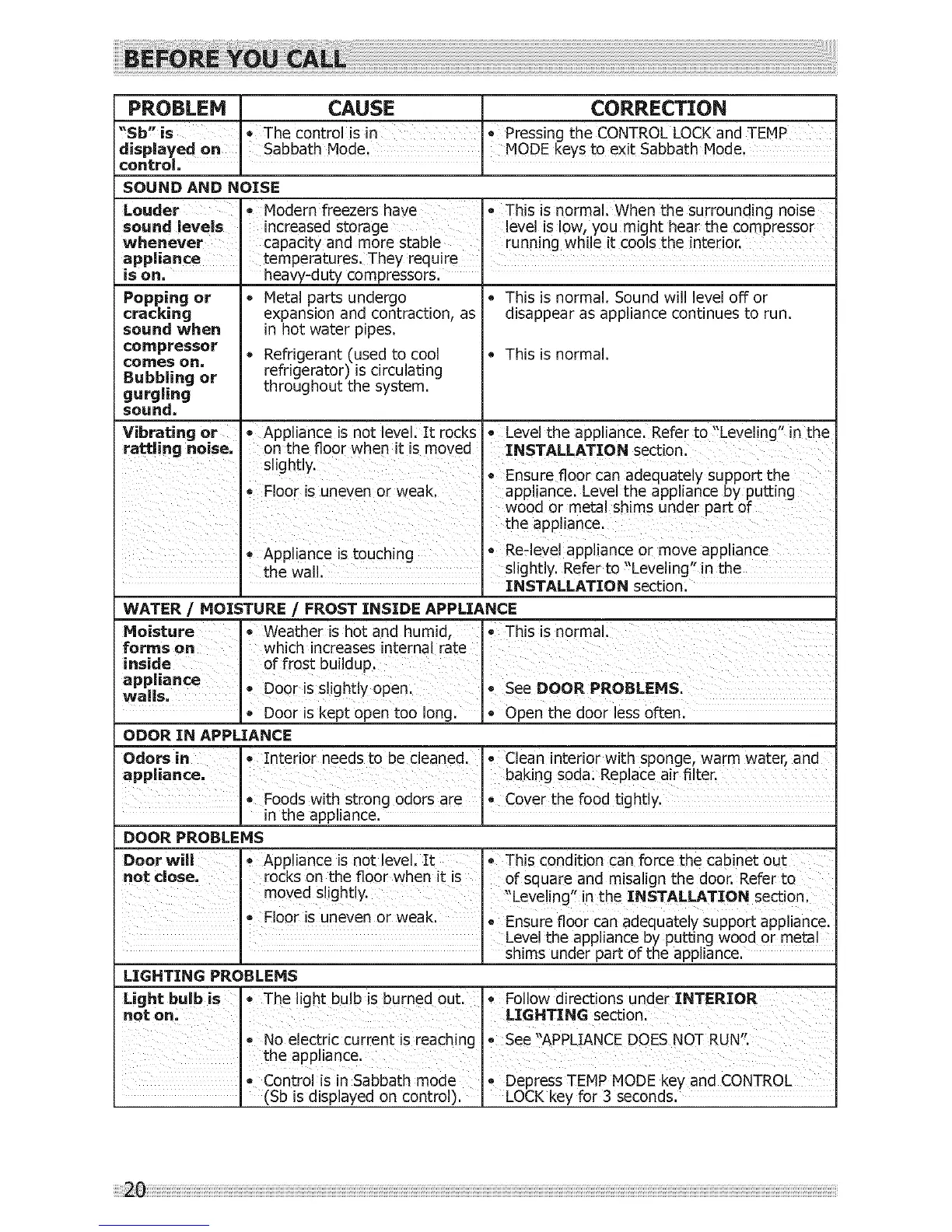 Vibrating or e Appliance is not level: It rocks Level the appliance. Refer to "Leveling" in the
