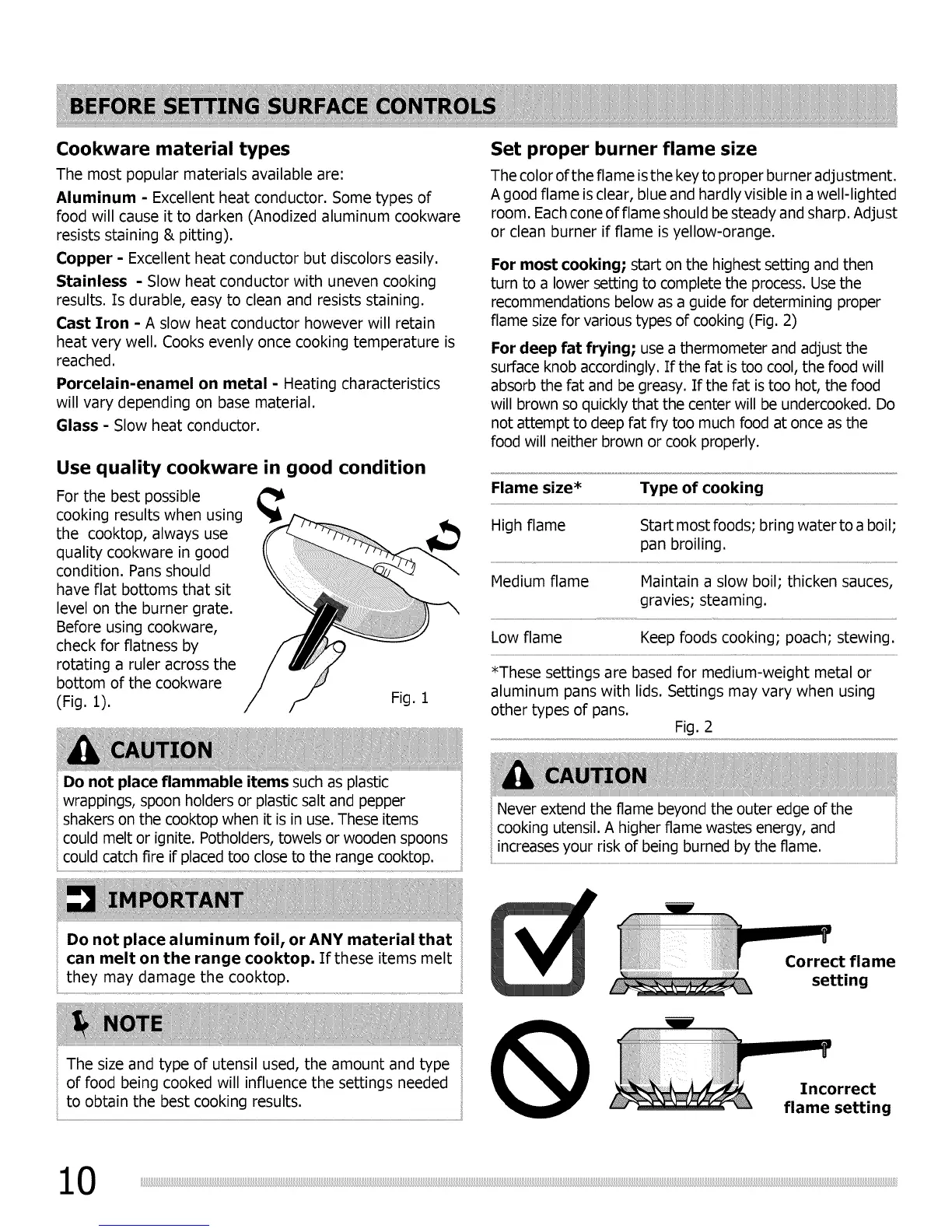 flame size for various types of cooking (Fig. 2)