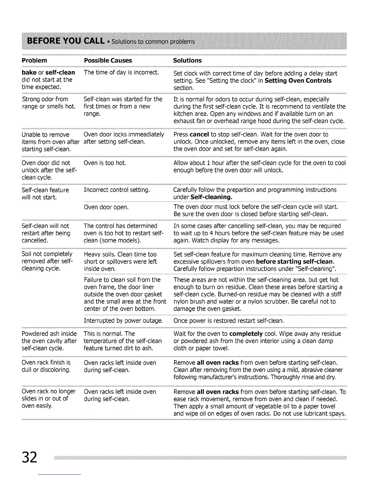 Self-clean feature Incorrect control setting. Carefully follow the prepartion and programming instructions