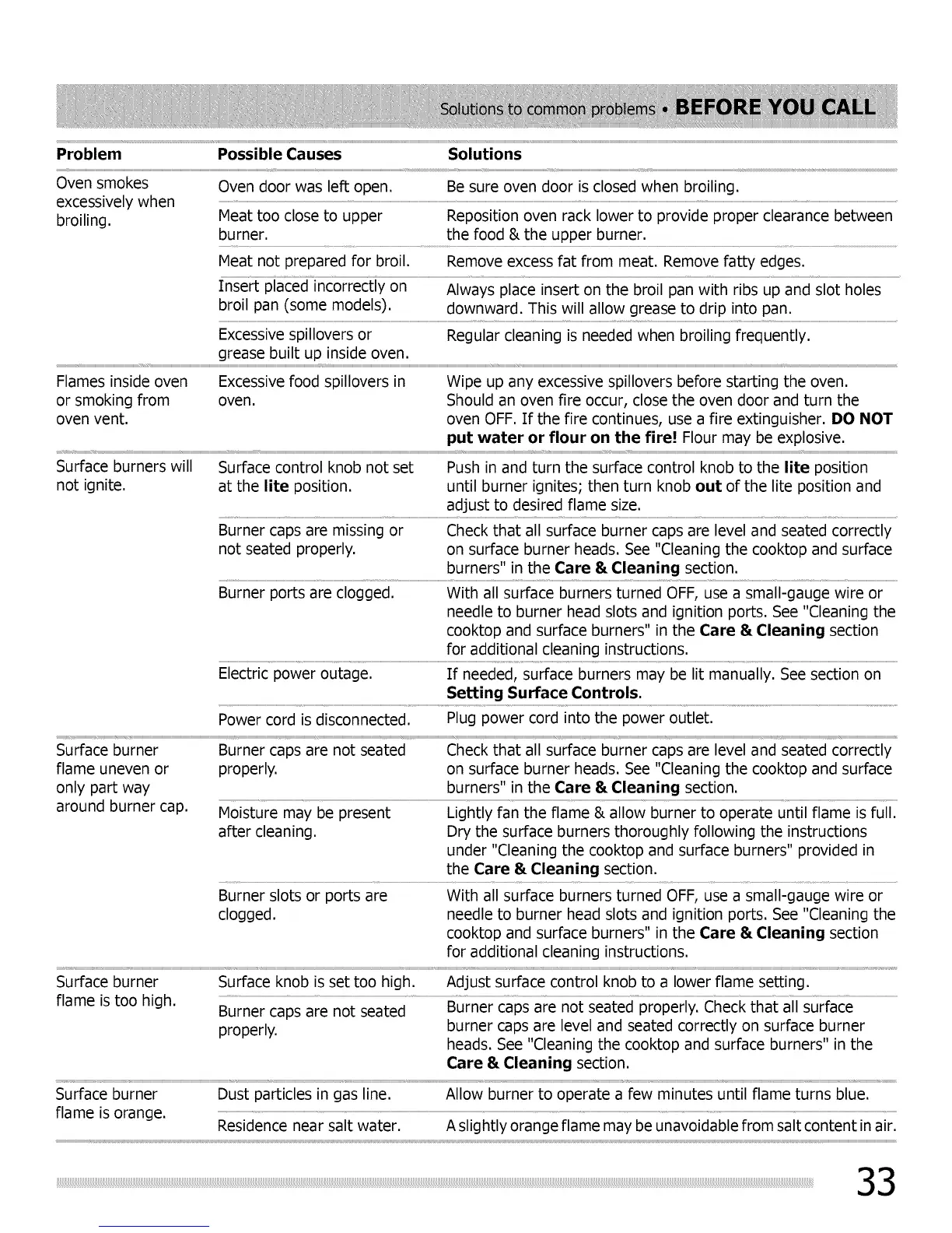 flame is too high. Burner CaPSare not Seated........................................................Burner caPS are not seated properly: CheCk that all Surface............................................................