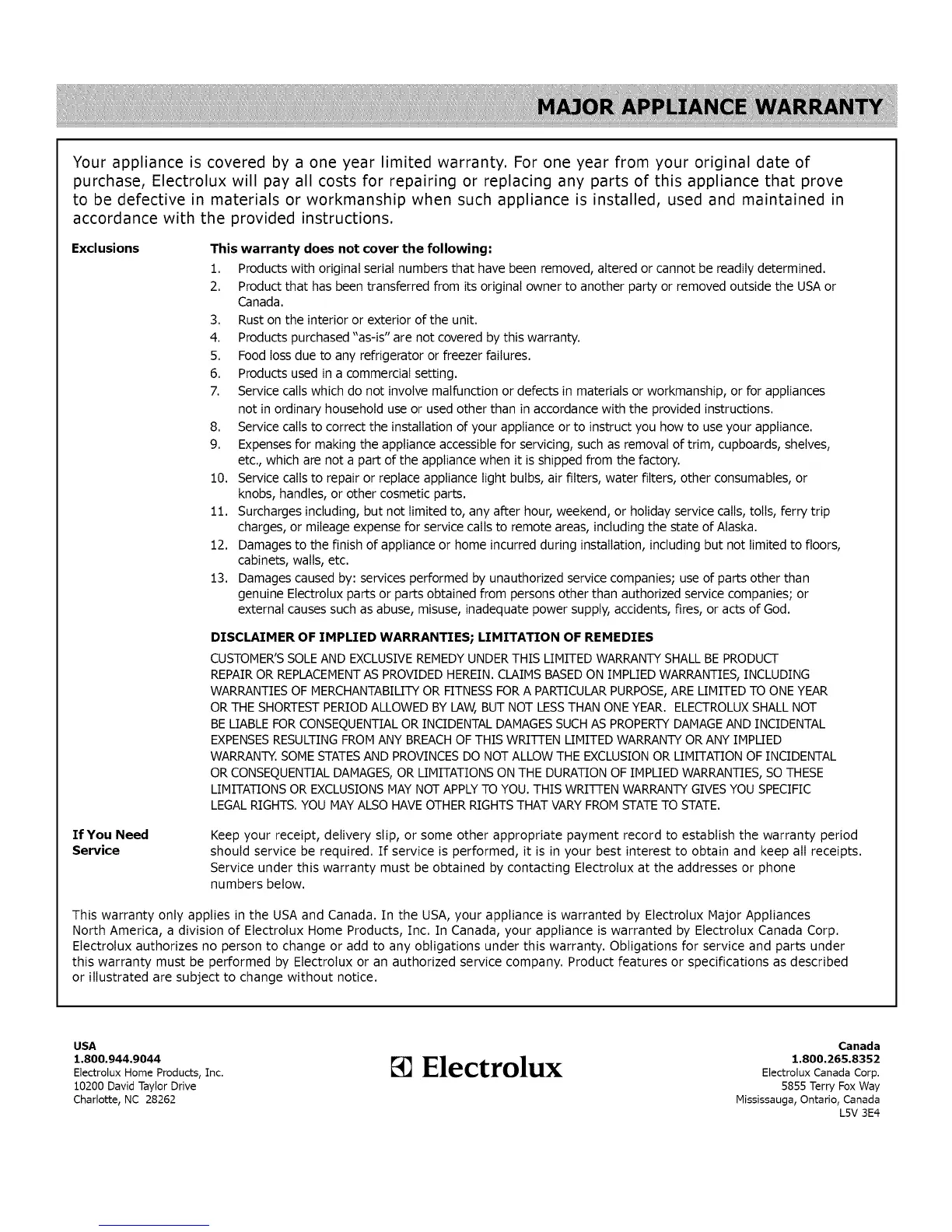 North America, a division of Electrotux Home Products, Inc. In Canada, your appliance is warranted by Electrotux Canada Corp.