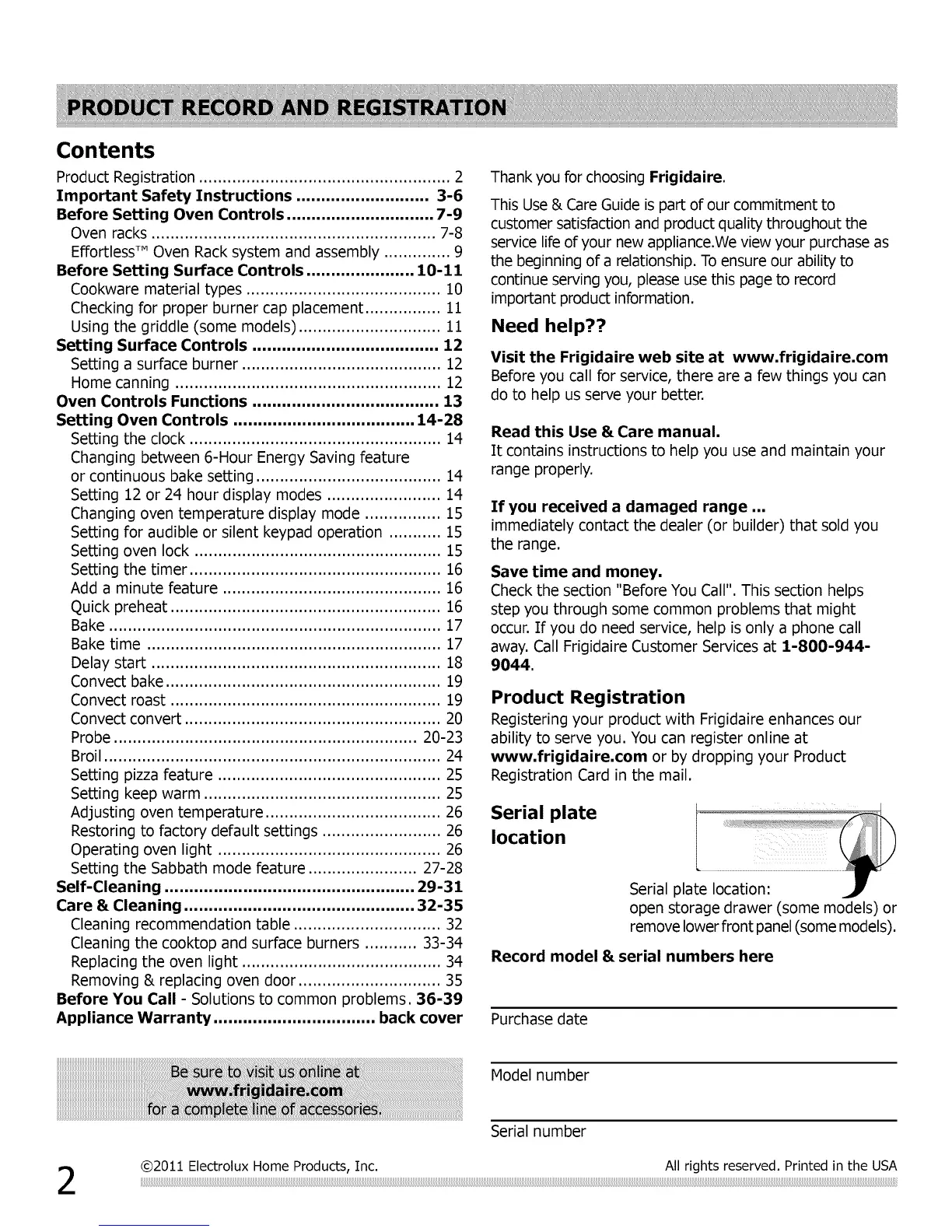 02011 ElectroluxHome Products, Inc. All rights reserved. Printedin the USA
