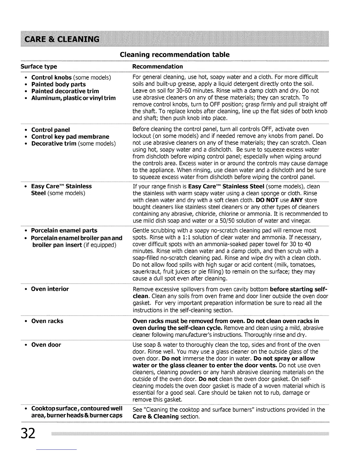 • Porcelain enamel parts Gentle scrubbing with a soapy no-scratch cleaning pad will remove most