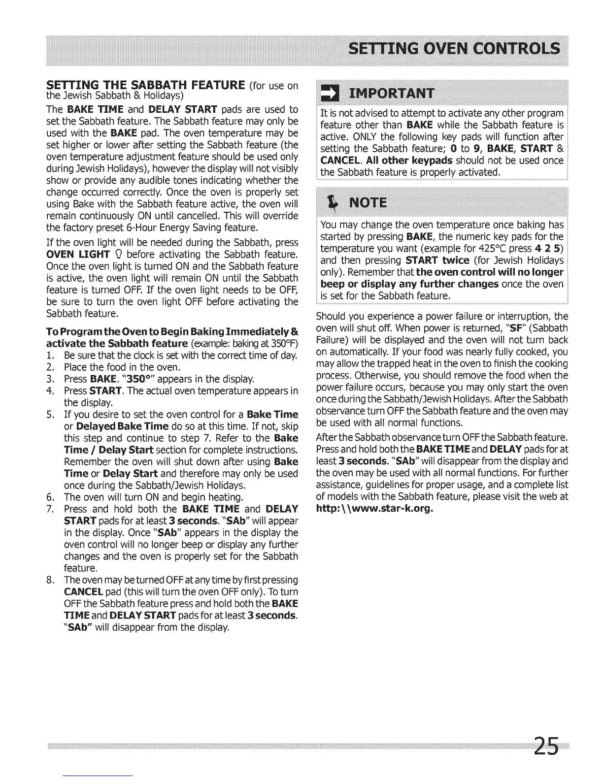 oven will shut off. When power is returned, "SF" (Sabbath