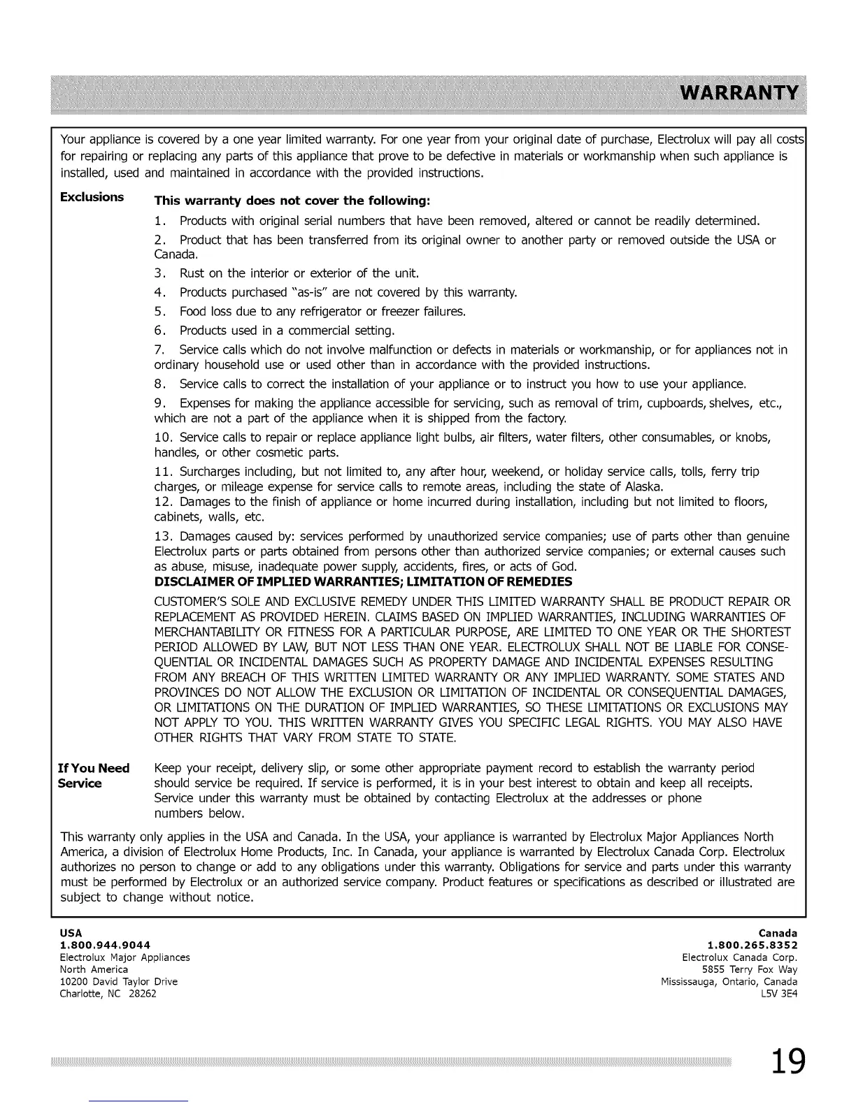 America, a division of Electrolux Home Products, Inc. In Canada, your appliance is warranted by Electrolux Canada Corp. Electrolux