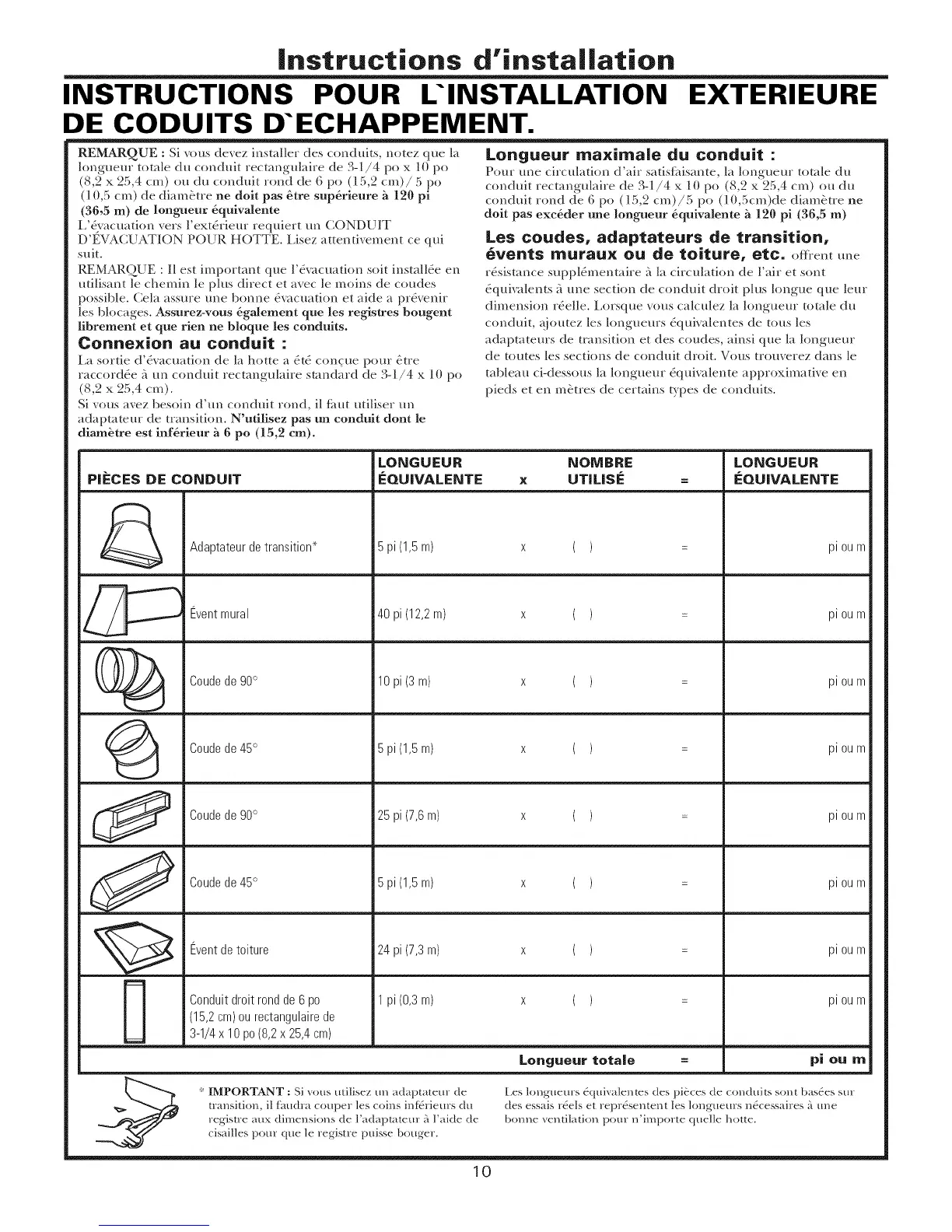 lnngueur totale du conduit rectangulaire de 3-1/4 pox 10 po