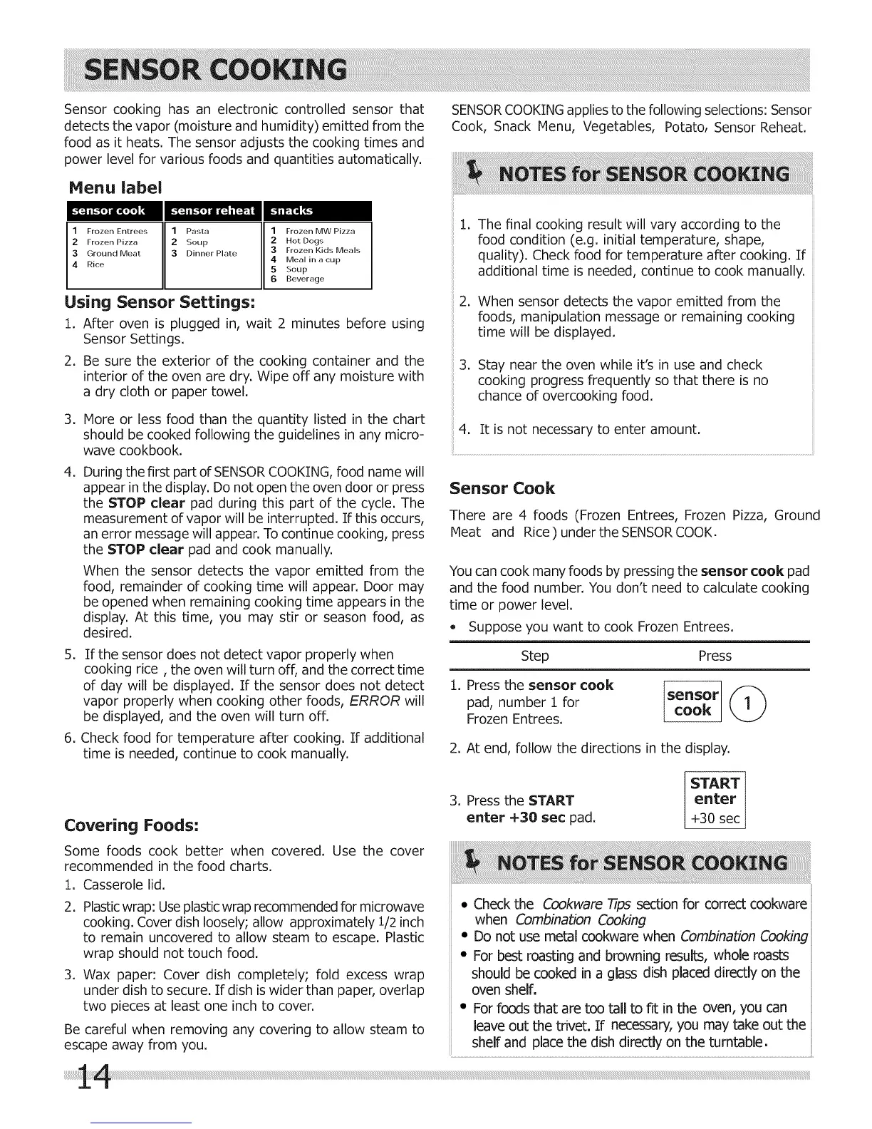SENSOR COOKING applies to the following selections: Sensor