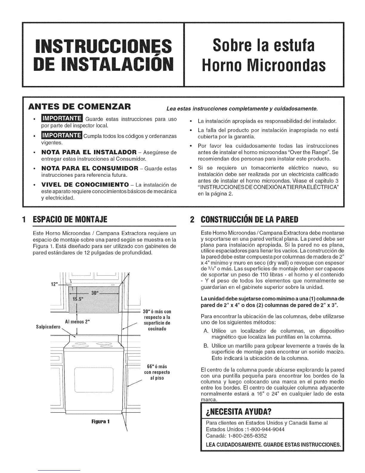 antes de instalar el homo microondas "Over the Range". Se