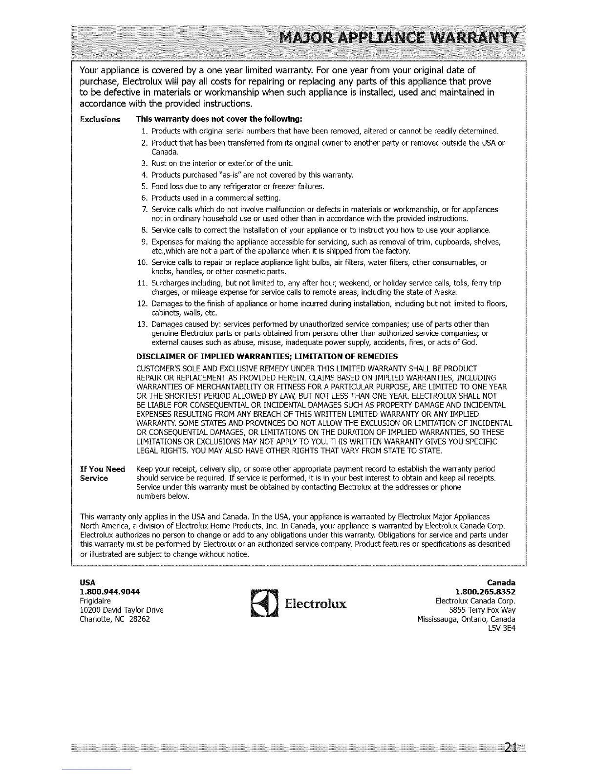 North America, a division of Electrolux Home Products, Inc. In Canada, your appliance is warranted by Electrolux Canada Corp.
