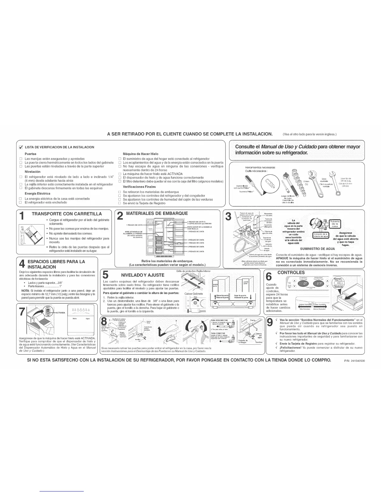 Sl NO ESTA SATlSFECHO CON LA INSTALACION DE SU REFRIGERADOR, POR FAVOR PONGASE EN CONTACTO CON LA TIENDA DONDE LO COMPRO. P/N:241540500
