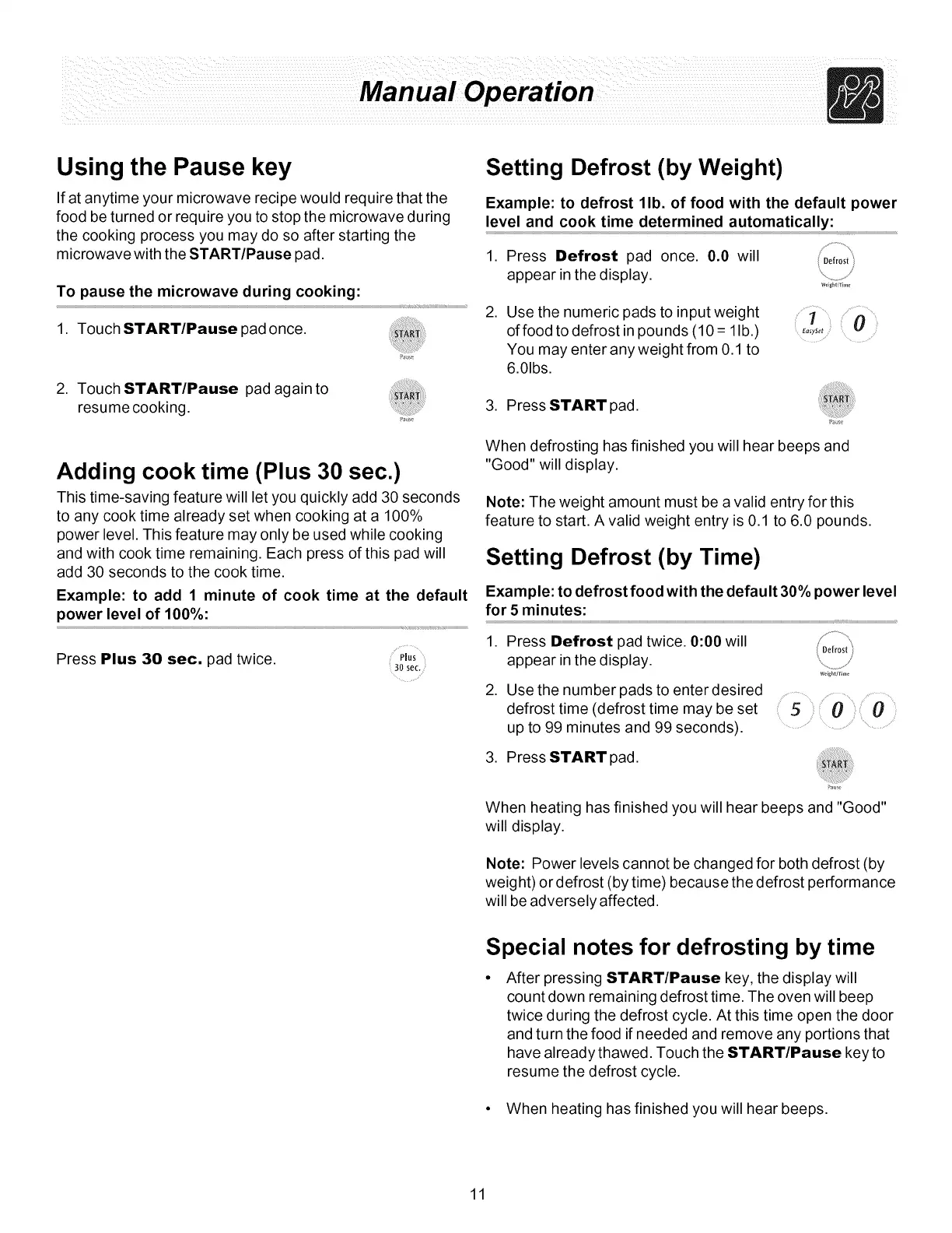 1. Press Defrost pad twice. 0:00 will