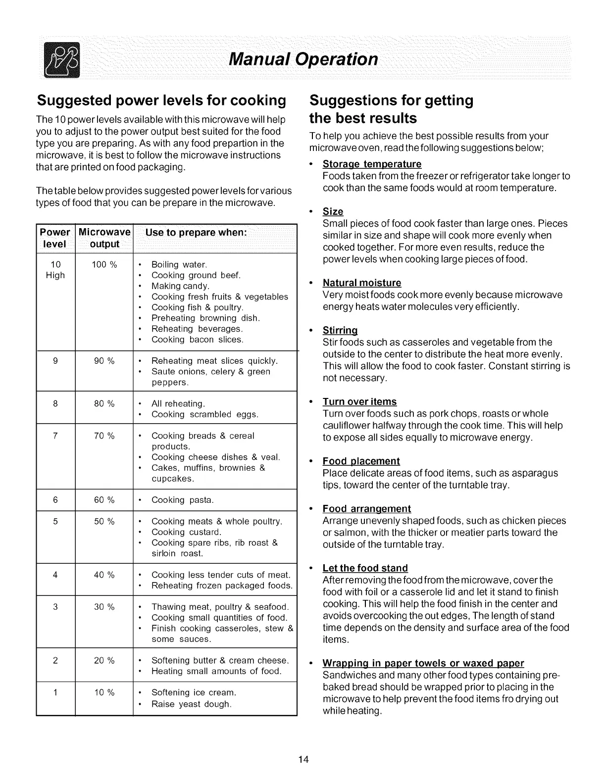 Suggested power levels for cooking