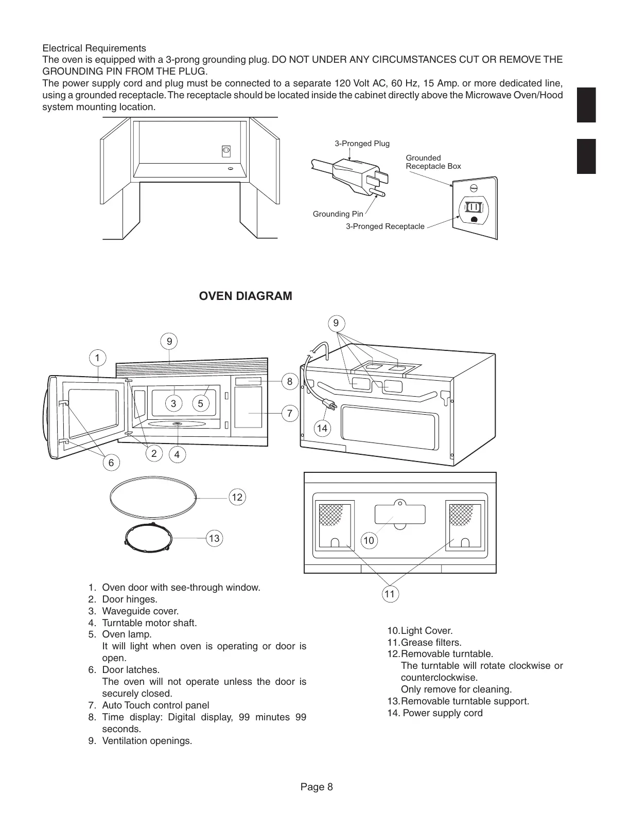 using a grounded receptacle. The receptacle should be located inside the cabinet directly above the Microwave Oven/Hood