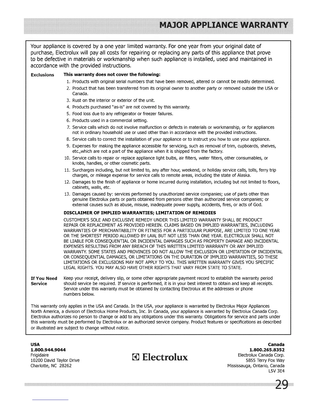 North America, a division of Electrolux Home Products, Inc. In Canada, your appliance is warranted by Electrolux Canada Corp.