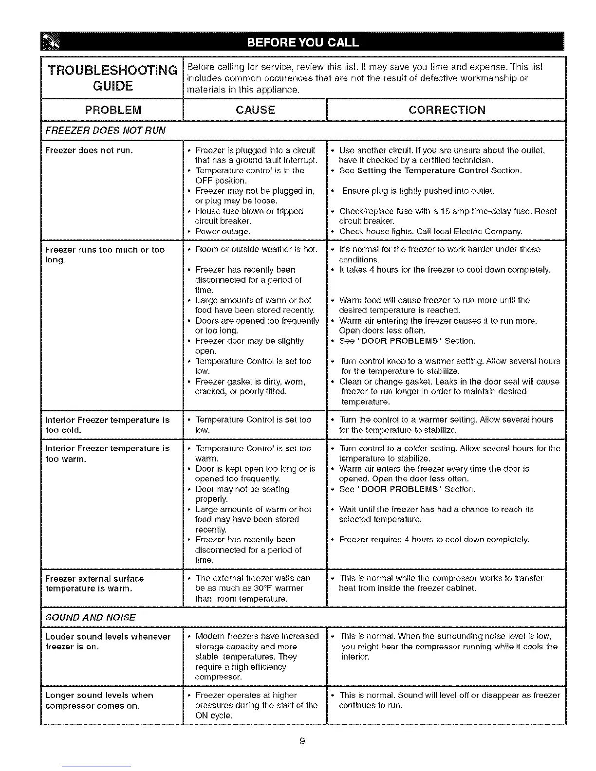 Longer sound levels when * Freezer operates at higher * This is normal. Sound will level oft or disappear as freezer