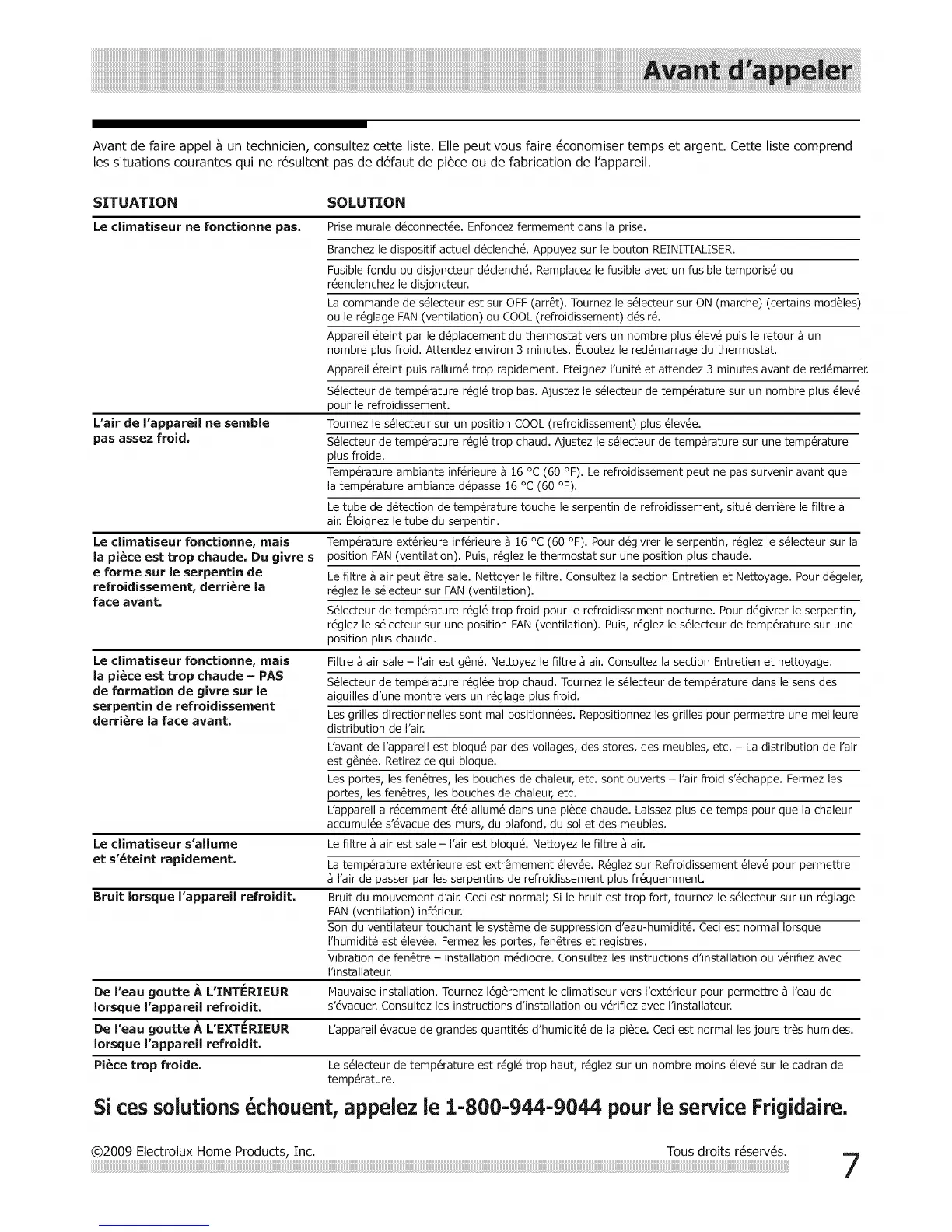 Sicessolutions chouent, appelez le 1-800-944-9044 pour ie serviceFrigidaire,