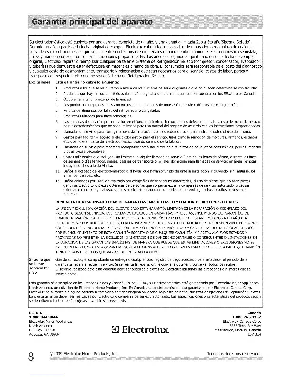 Esta garantia s61o se aplica en los Estados Unidos y Canada. En los EE.UU., su electrodom6stico est_ garantizado por Electrolux Major Appliances