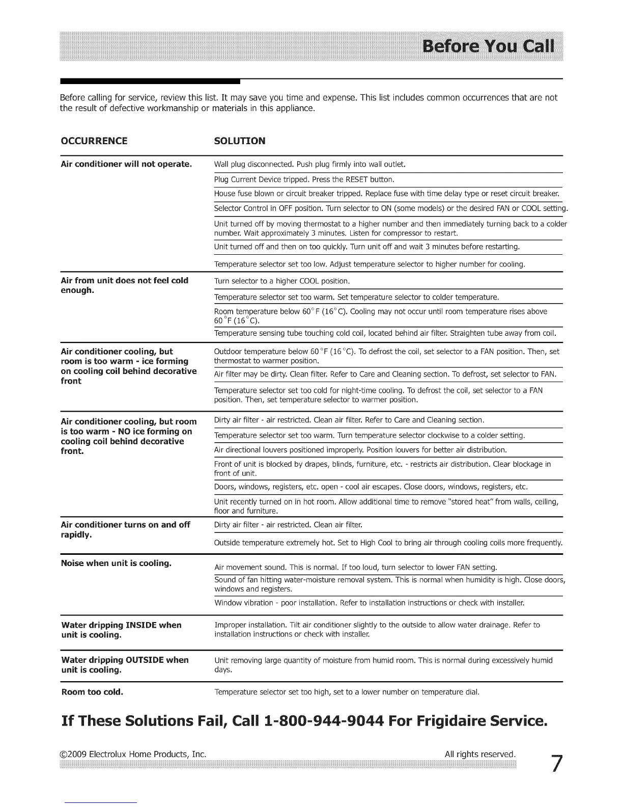 If These Solutions Fail, Call 1=800=944-9044 For Frigidaire Service,
