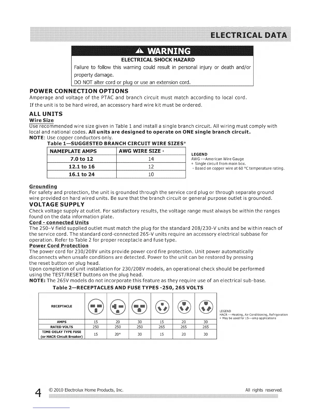 Table 2--RECEPTACLES AND FUSE TYPES -250, 265 VOLTS