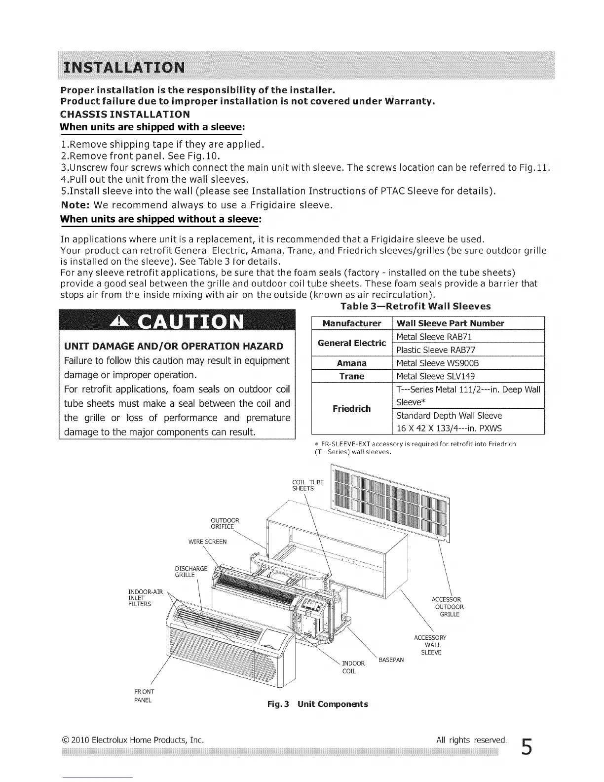 In applications where unit is a replacement, it is recommended that a Frigidaire sleeve be used.