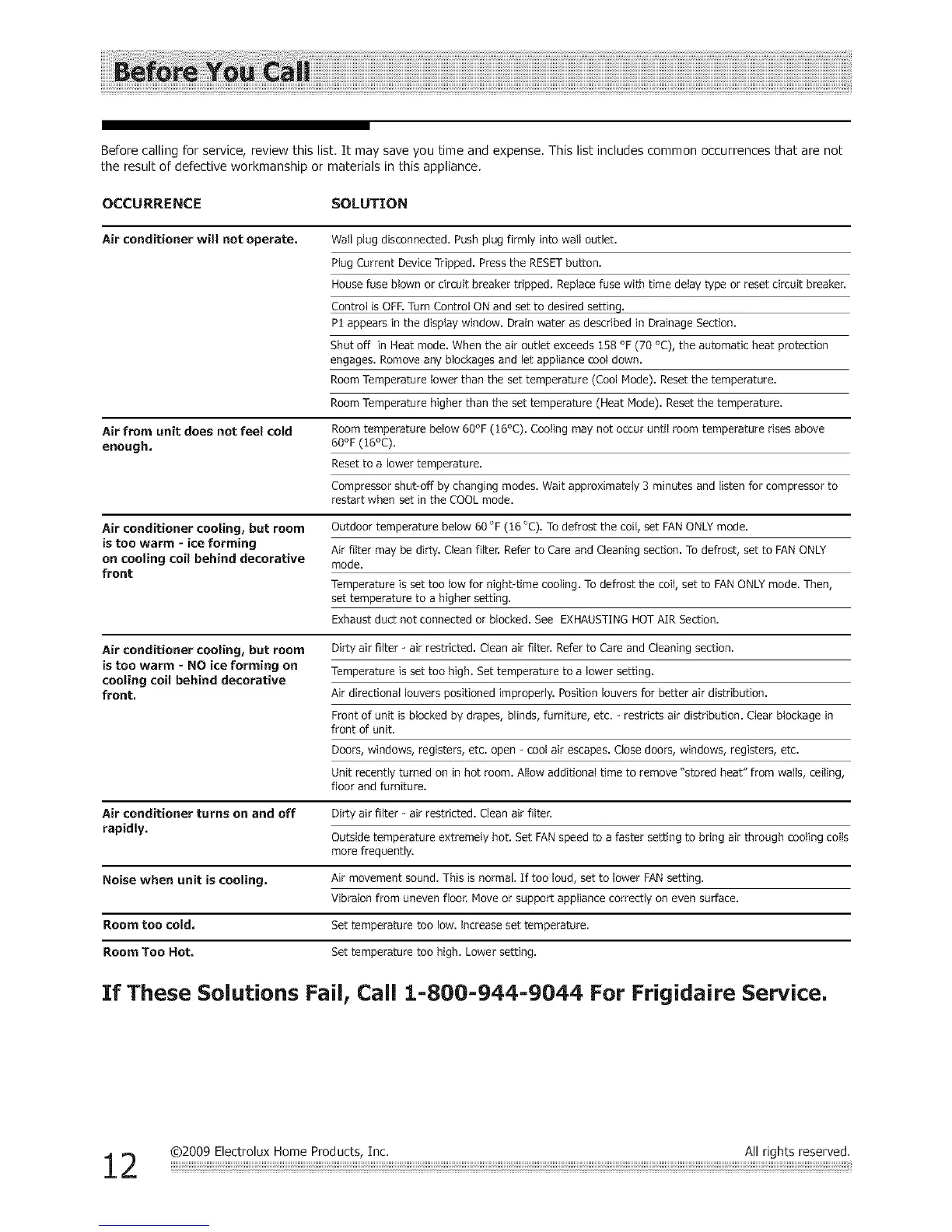 If These Solutions Fail, Call 1-800-944-9044 For Frigidaire Service,