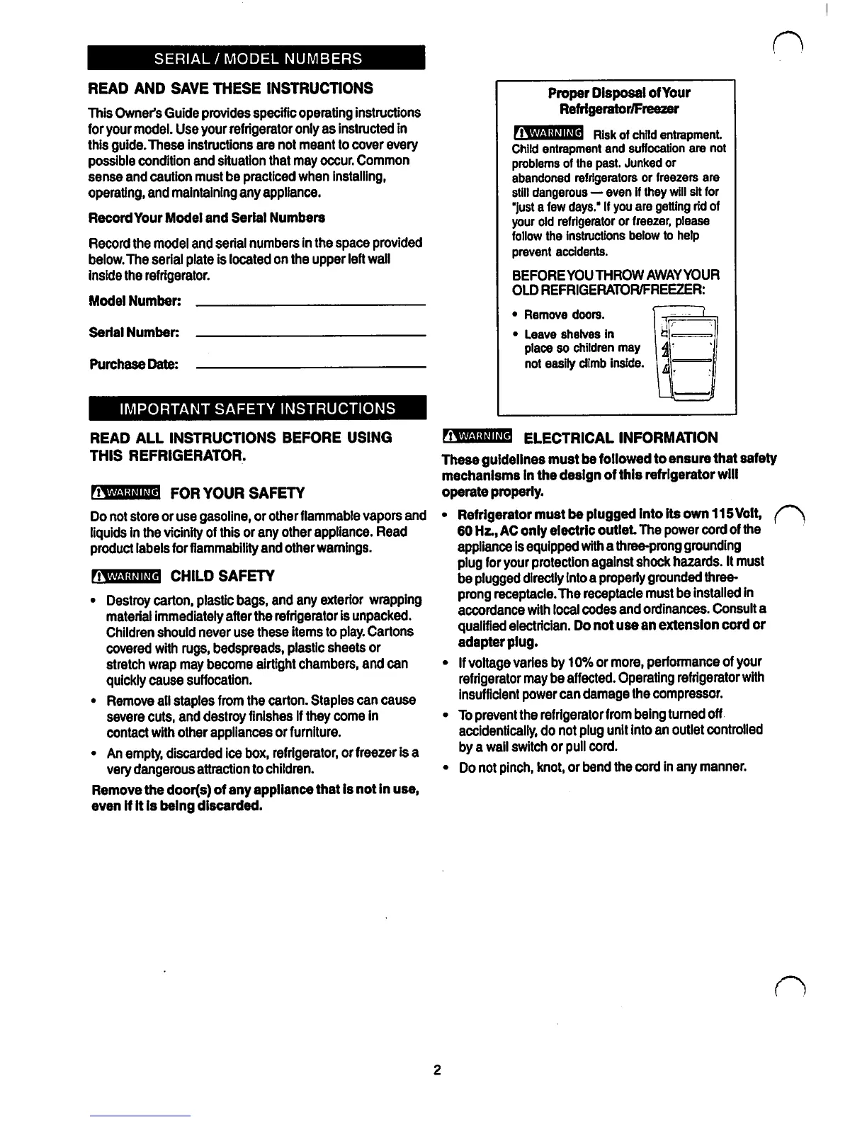 Frigidaire FRC331GM - Record Serial;Model Numbers; Safety Instructions