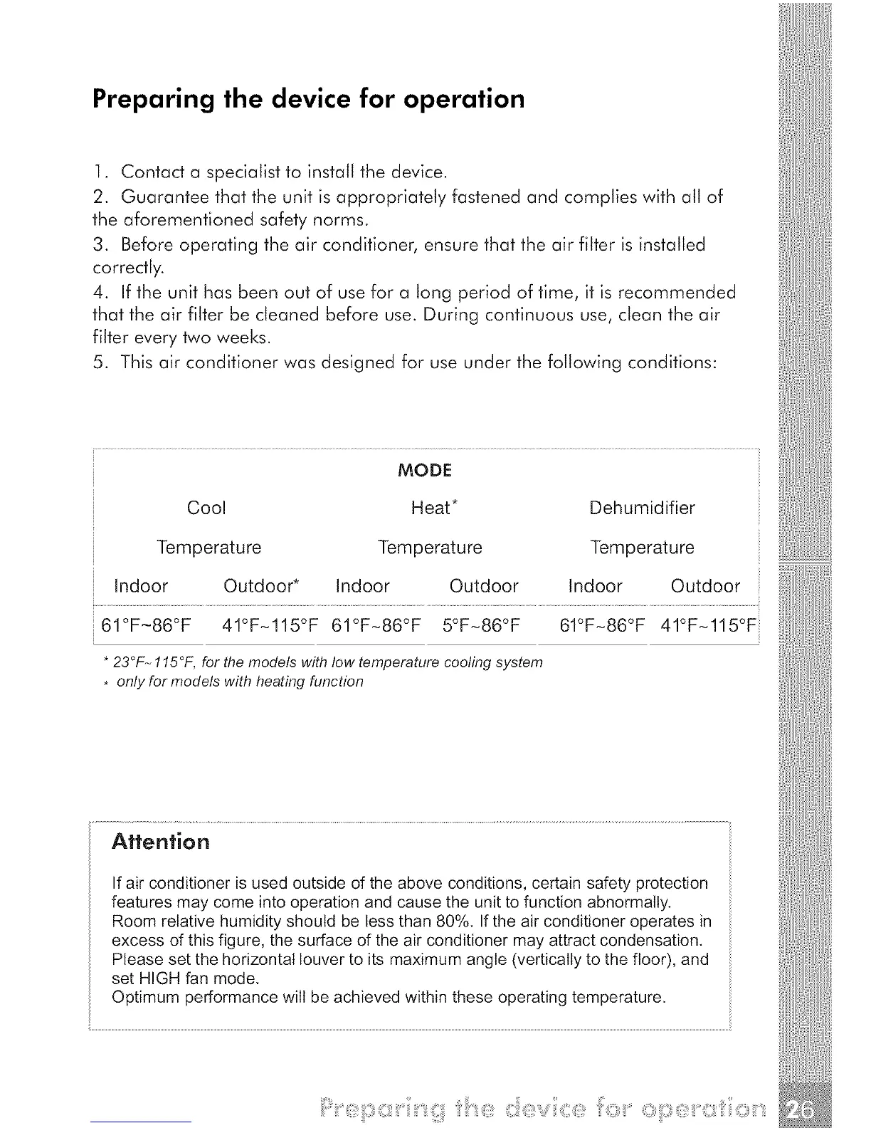 5. This air conditioner was designed for use under the following conditions: