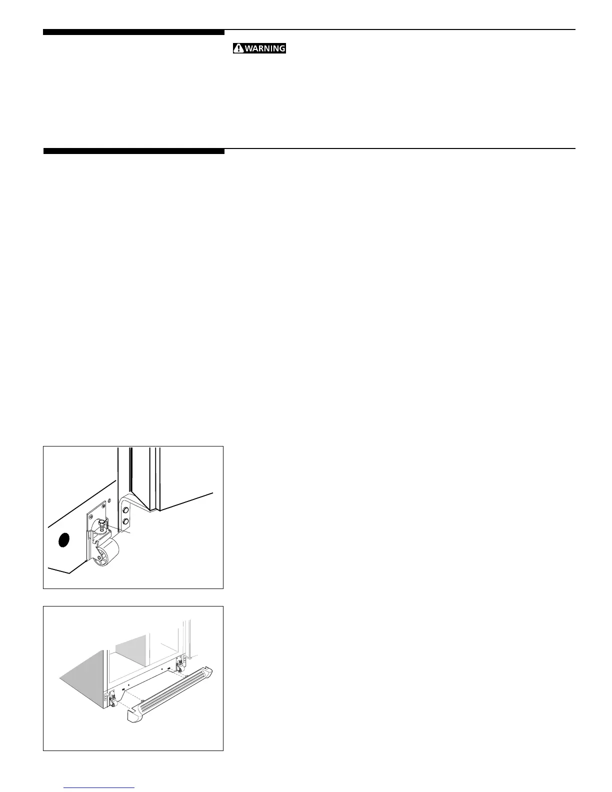 • To adjust front rollers: Open refrigerator and freezer doors. Remove toe grill