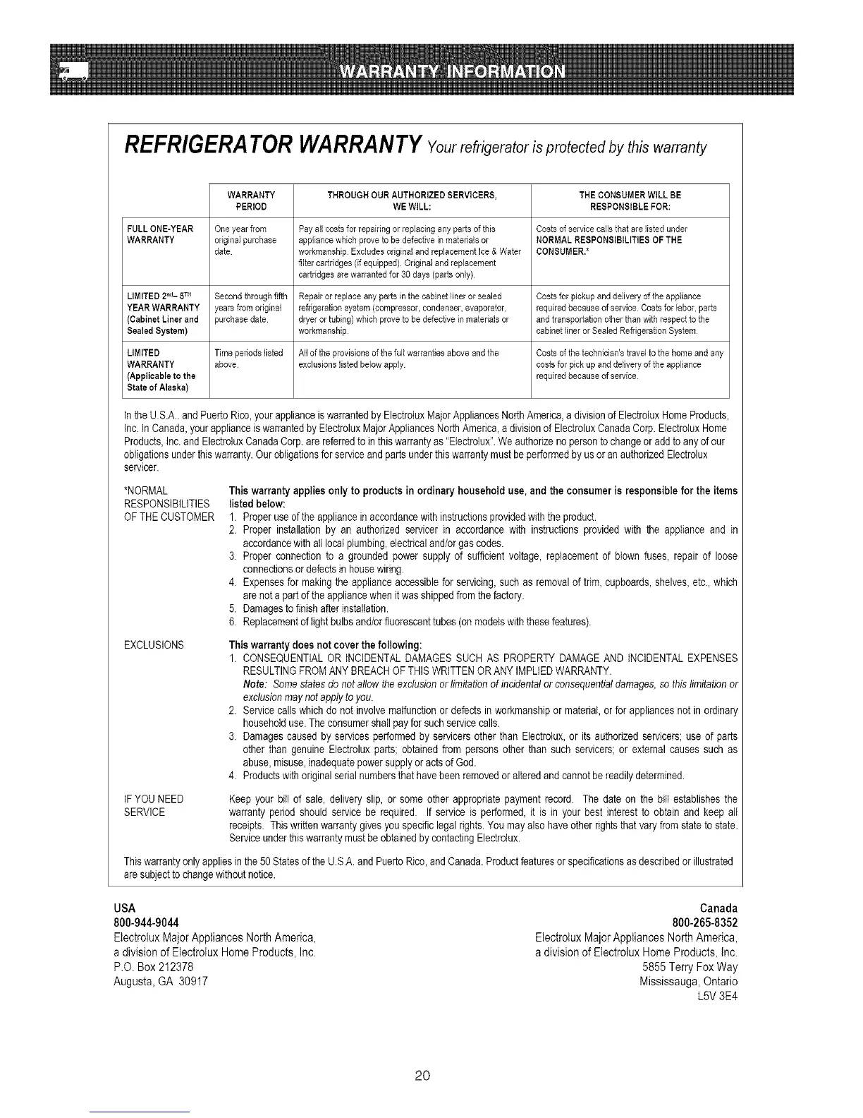 Products,Inc.and ElectroluxCanadaCorp.are referredto in thiswarrantyas "Electrolux".We authorizenopersontochangeor add to any ofour