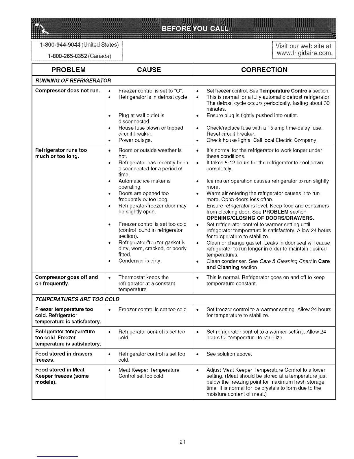 Refrigerator temperature • Refrigerator control is set too • Set refrigerator control to a warmer setting. Allow 24