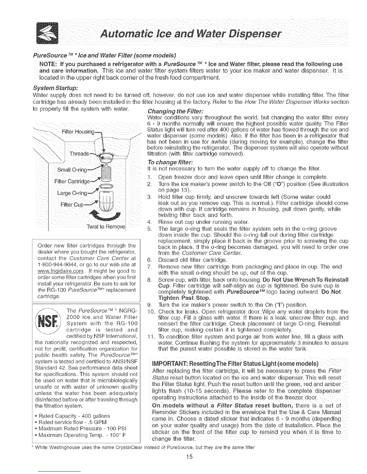 * White Westinghouse uses the name CrystaIClear instead of PureSource, but they are the same filter