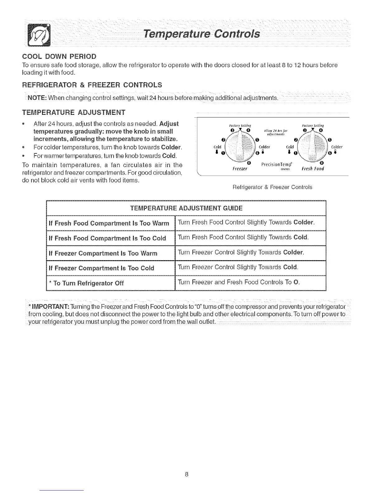 * iMPORTANT: Turning the Freezer and Fresh Food Controls to"0'! turns off the compressor and prevents your refrigerator