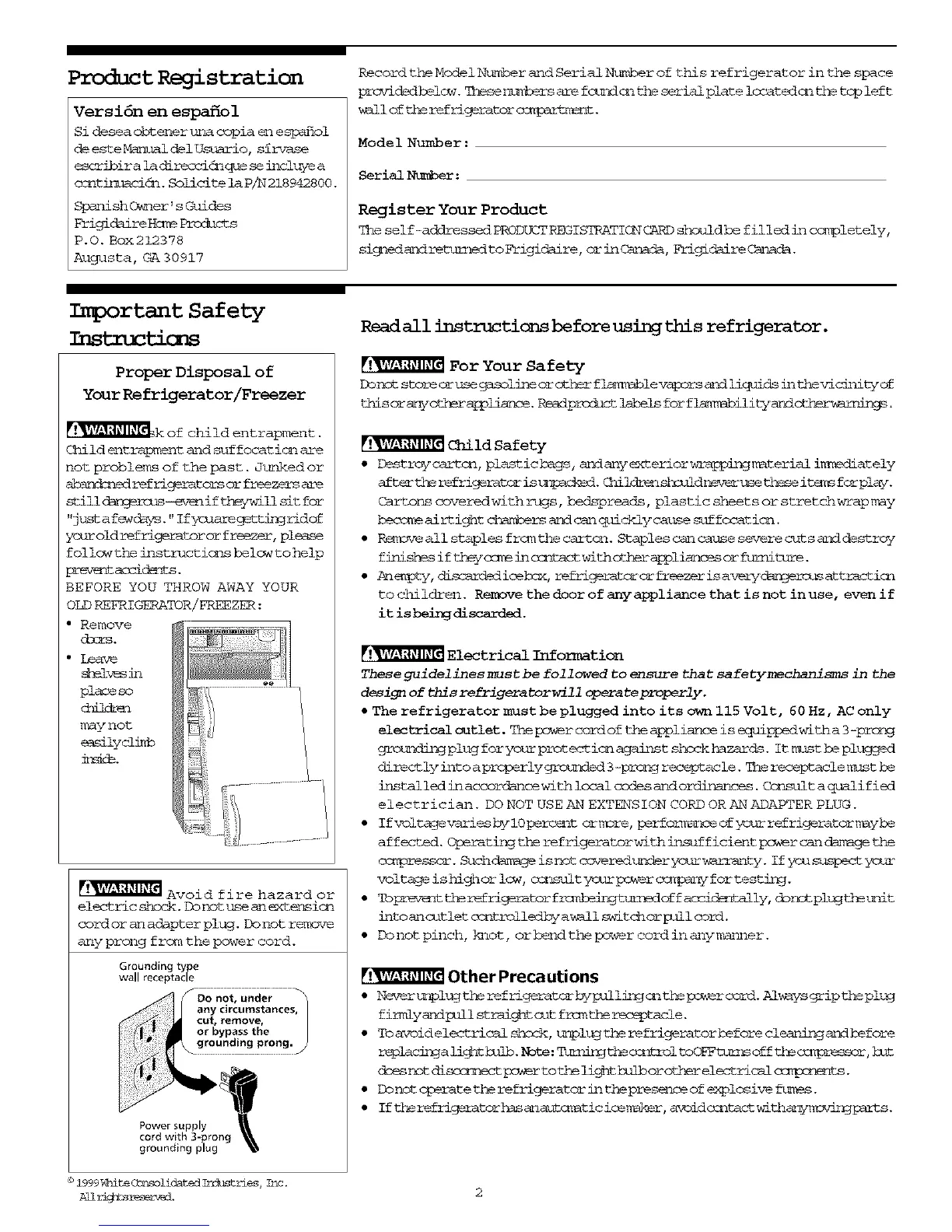 Record the Model Number and Serial Number of this refrigerator in the space