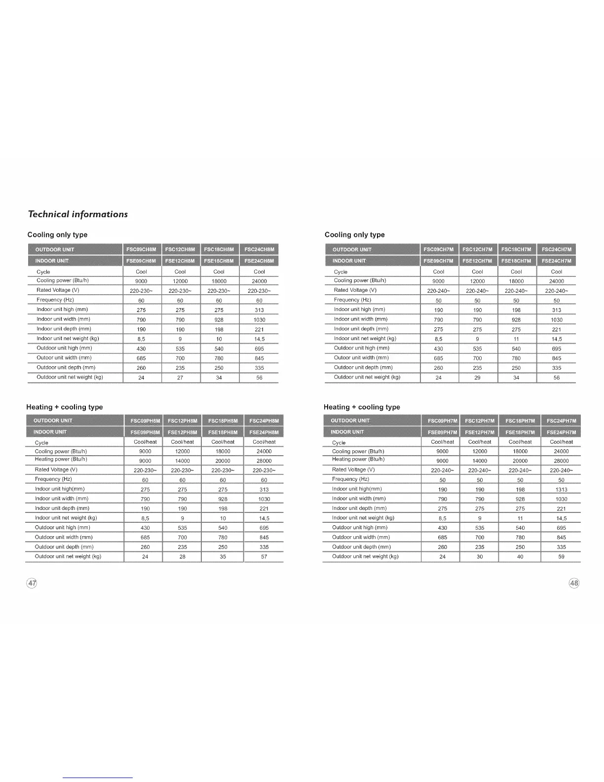 }ndoor unit net weight (kg)
