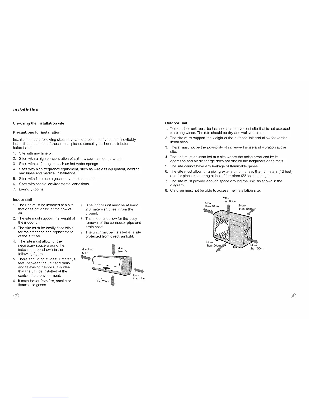 1. The outdoor unit must be installed at a convenient site that is not exposed