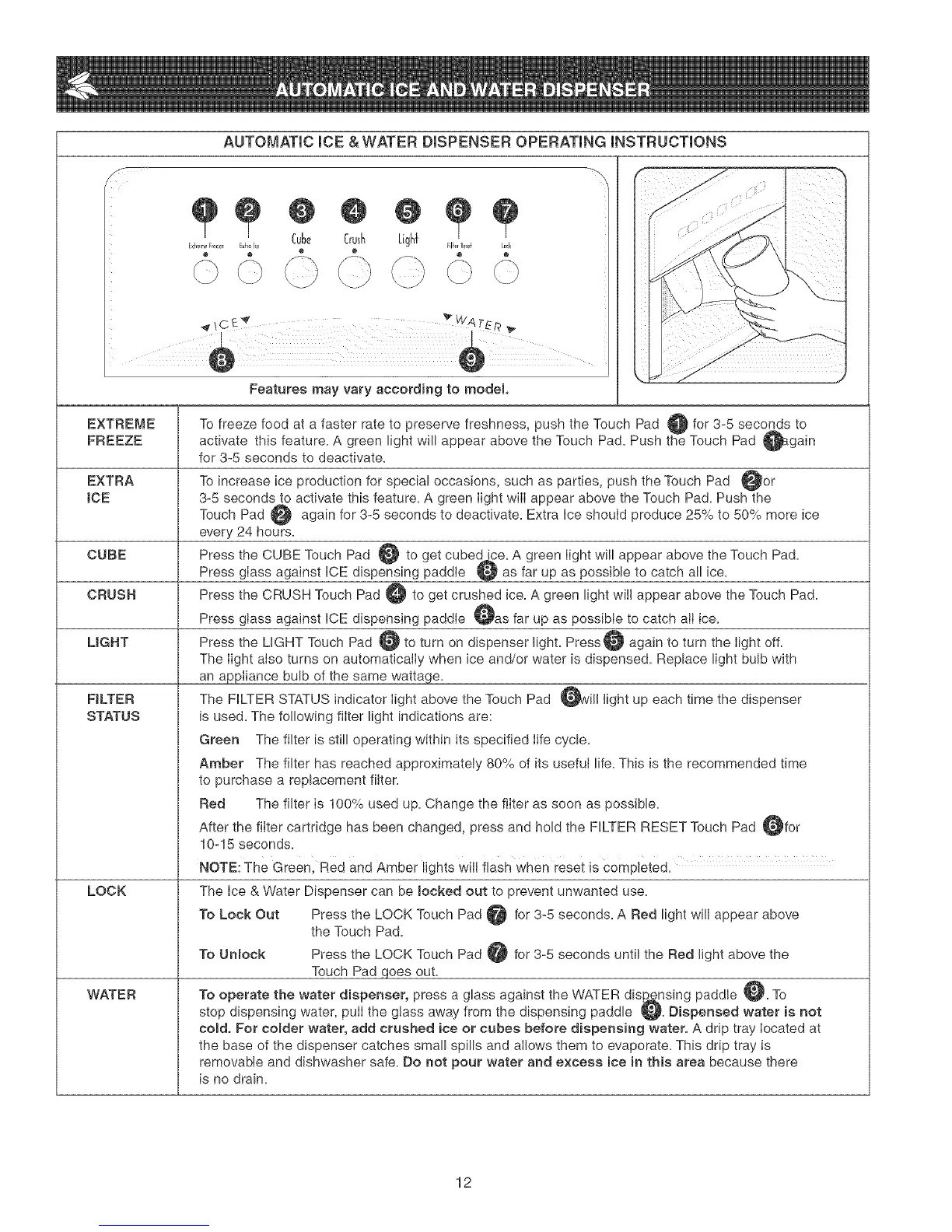 Press the LIGHT Touch Pad @ to turn on dispenser light. Press@ again to turn the light off.