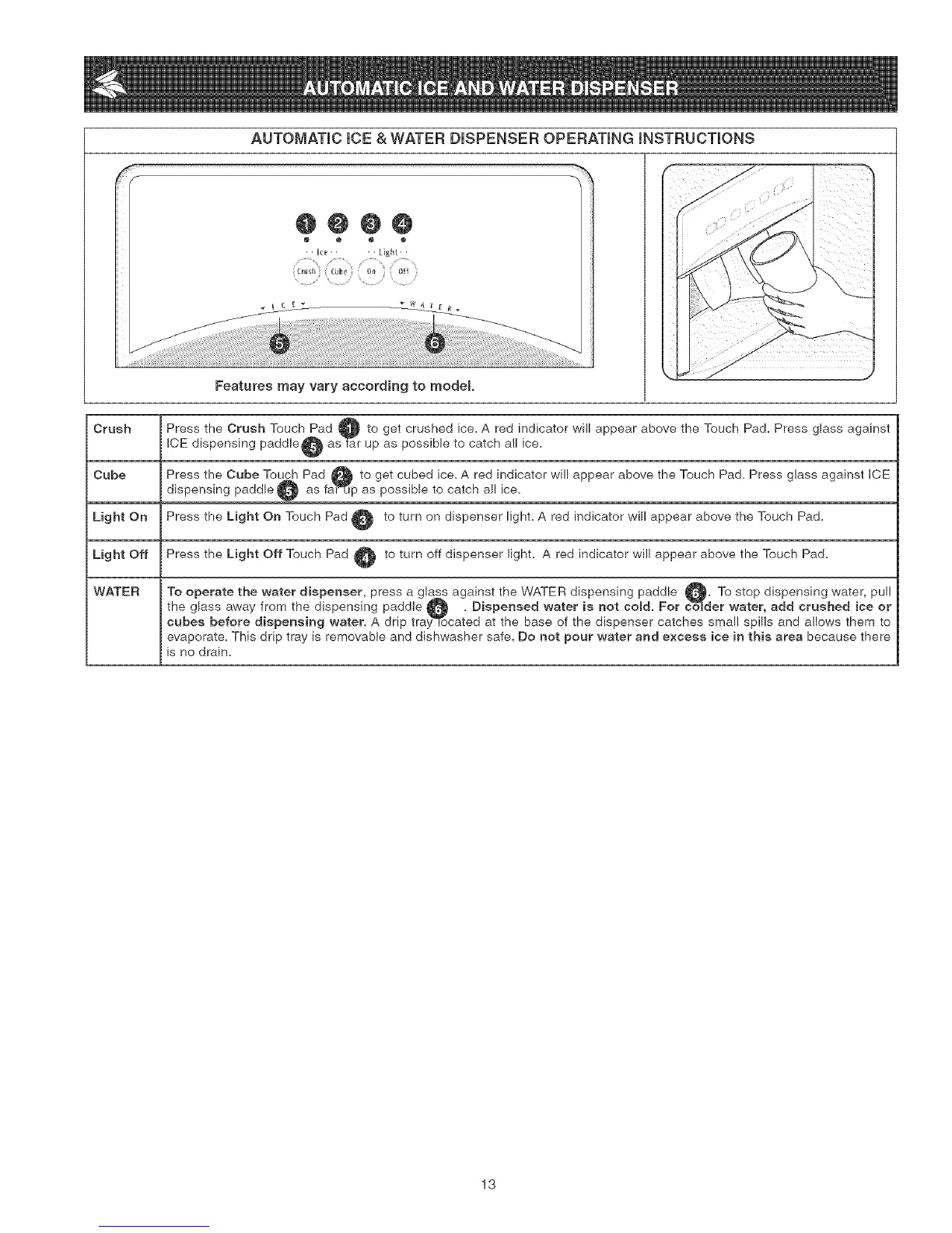 Light On Press the Light On Touch Pad @ to turn on dispenser light. A red indicator will appear above the Touch Pad.