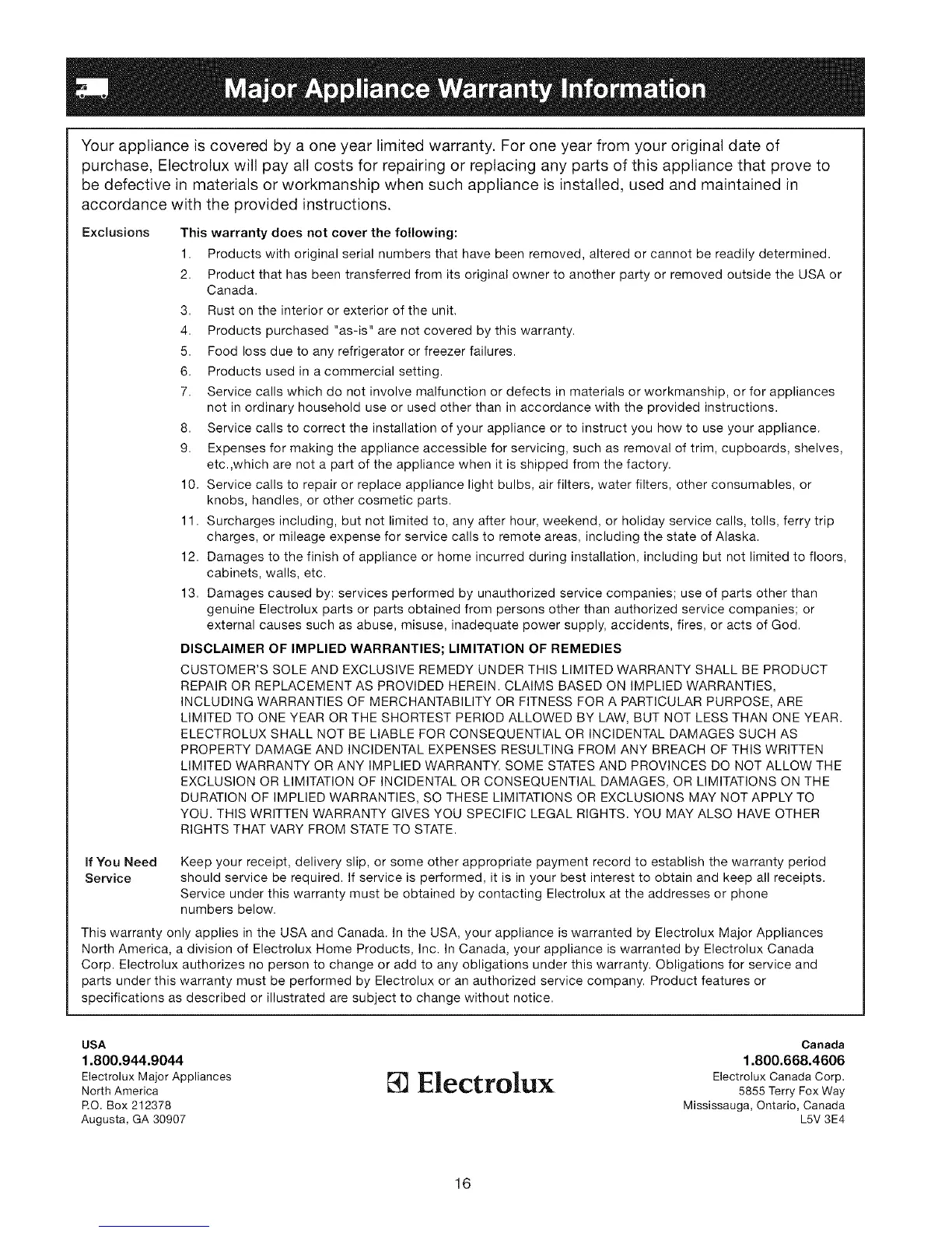 North America, a division of Electrolux Home Products, Inc. In Canada, your appliance is warranted by Electrolux Canada