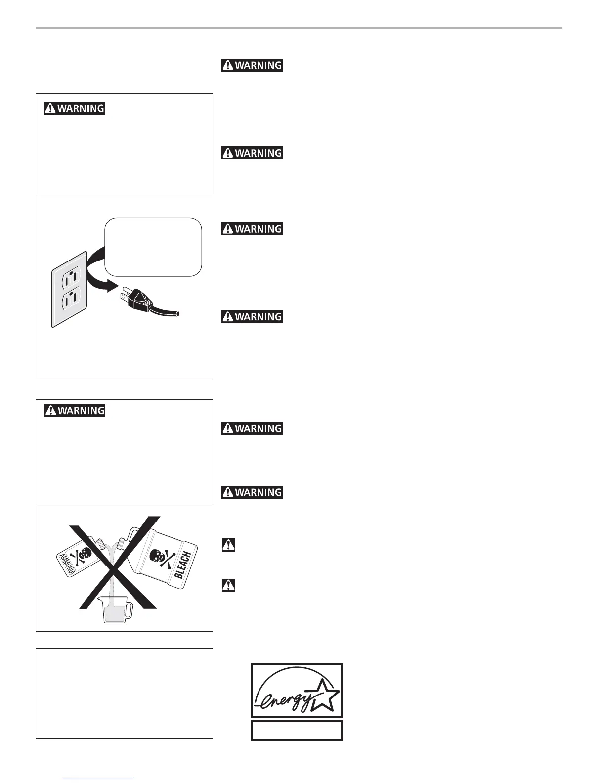• Do not mix chlorine bleach with ammonia or acids such as vinegar.