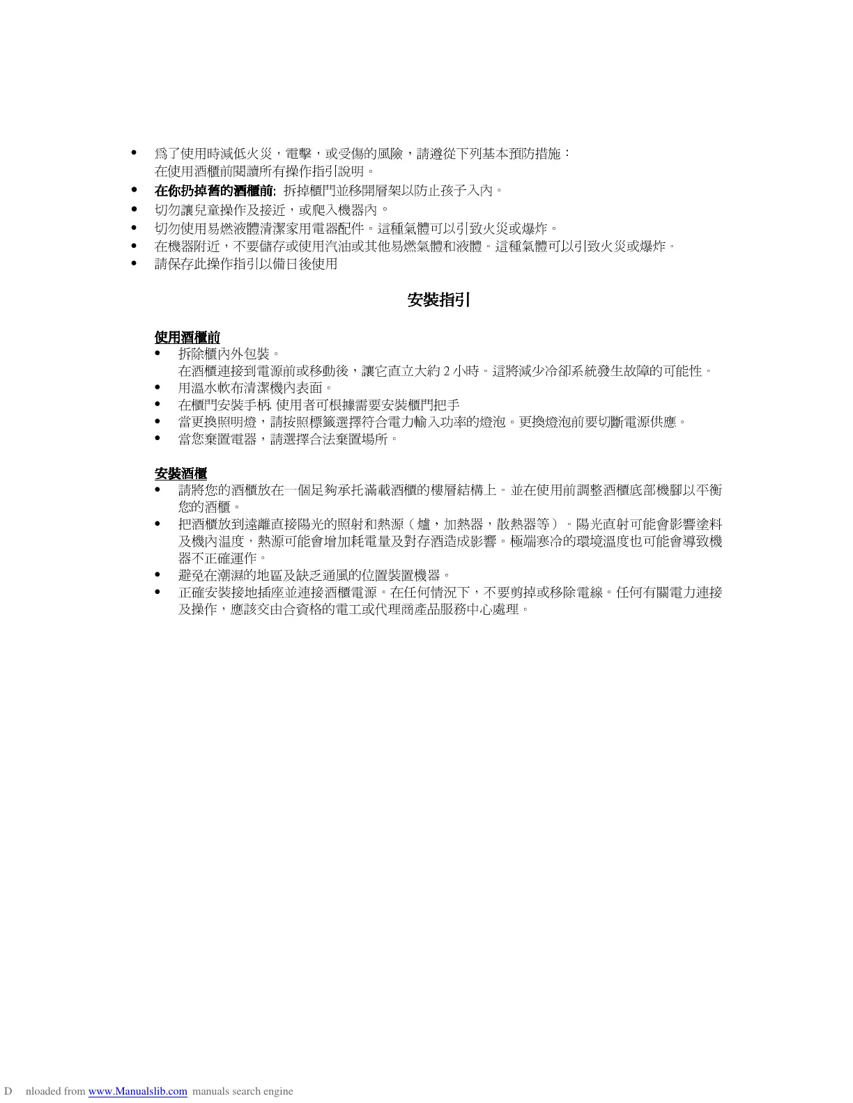 在酒櫃連接到電源前或移動後,讓它直立大約 2 小時。這將減少冷卻系統發生故障的可能性。