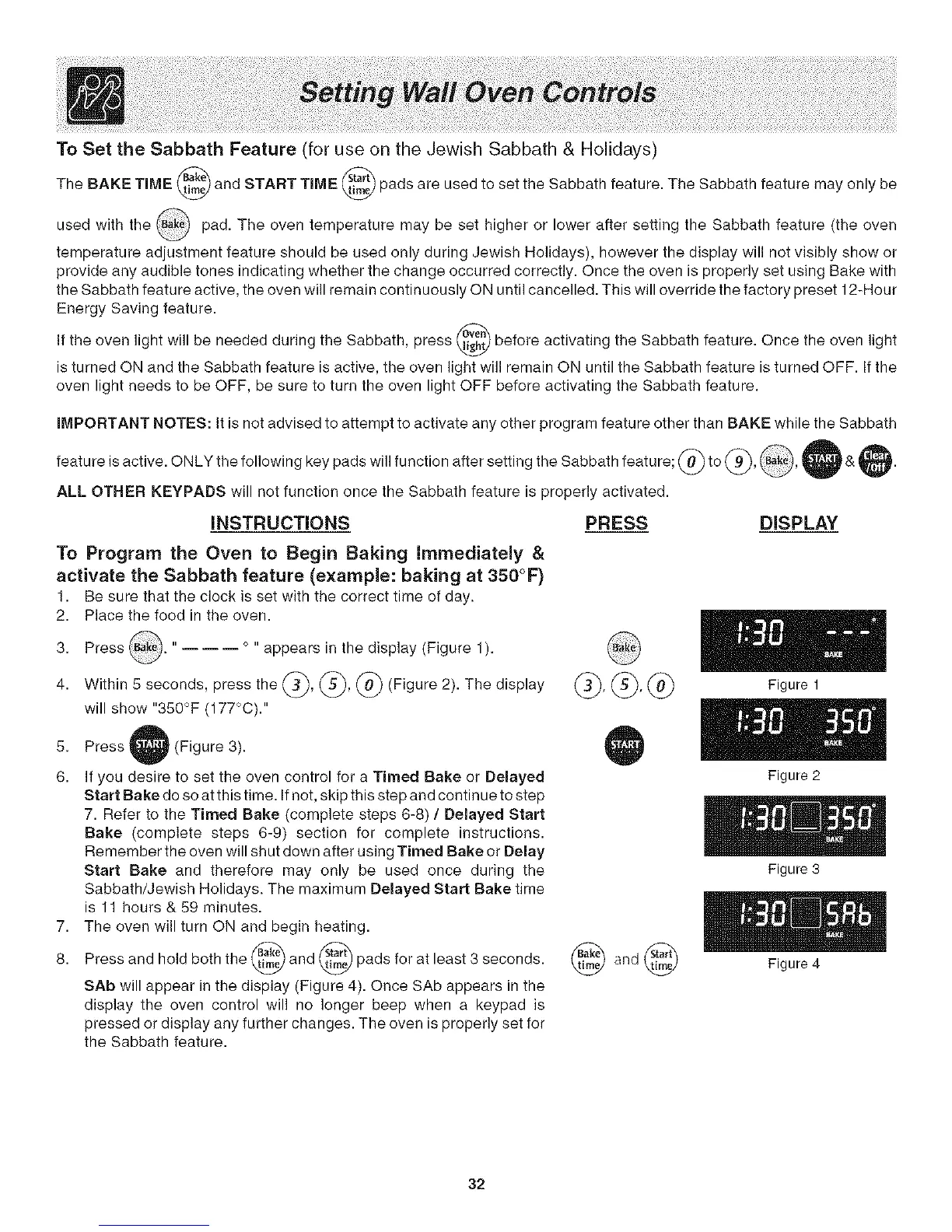 iMPORTANT NOTES: It is not advised to attempt to activate any other program feature other than BAKE while the Sabbath