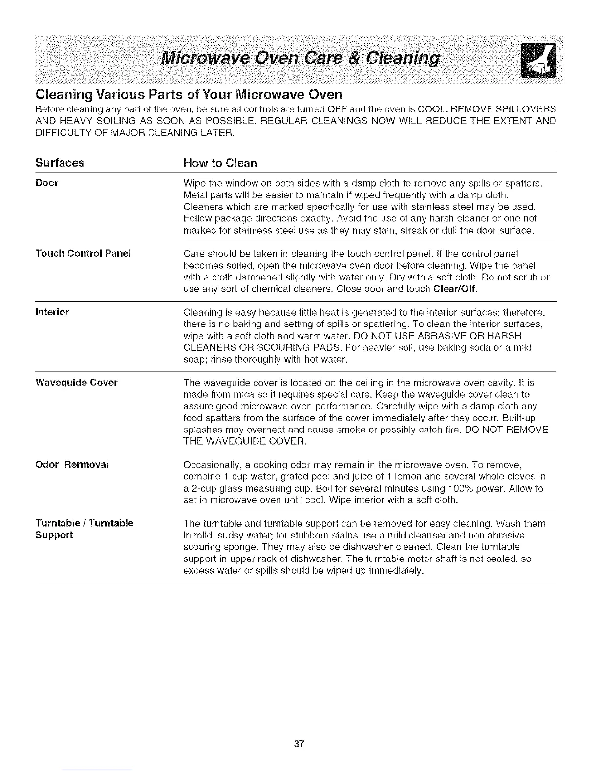 use any sort of chemical cleaners. Close door and touch Clear/Off.