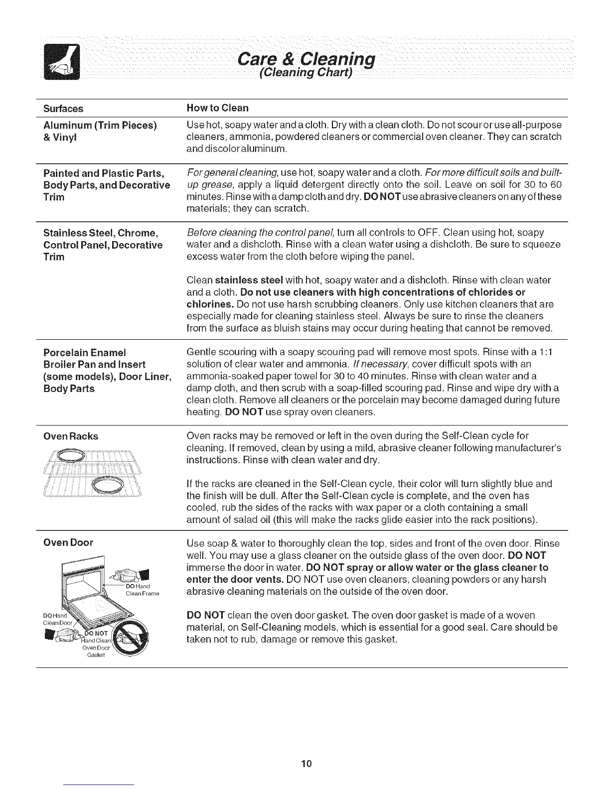 DO NOT clean the oven door gasket. The oven door gasket is made of a woven